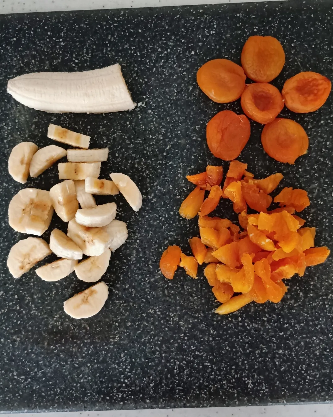 Разрежьте банан вдоль, затем нарежьте поперек на кусочки одинаковой толщины. Курагу нарежьте соломкой. Она должна быть хорошо размоченной, мягкой.