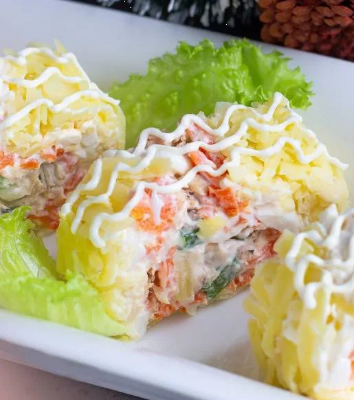 Нежный, яркий и очень вкусный салат-рулет, который станет чудесным украшением вашего новогоднего стола. Салат готовится по мотивам рецепта знаменитой Мимозы, с небольшими изменениями.