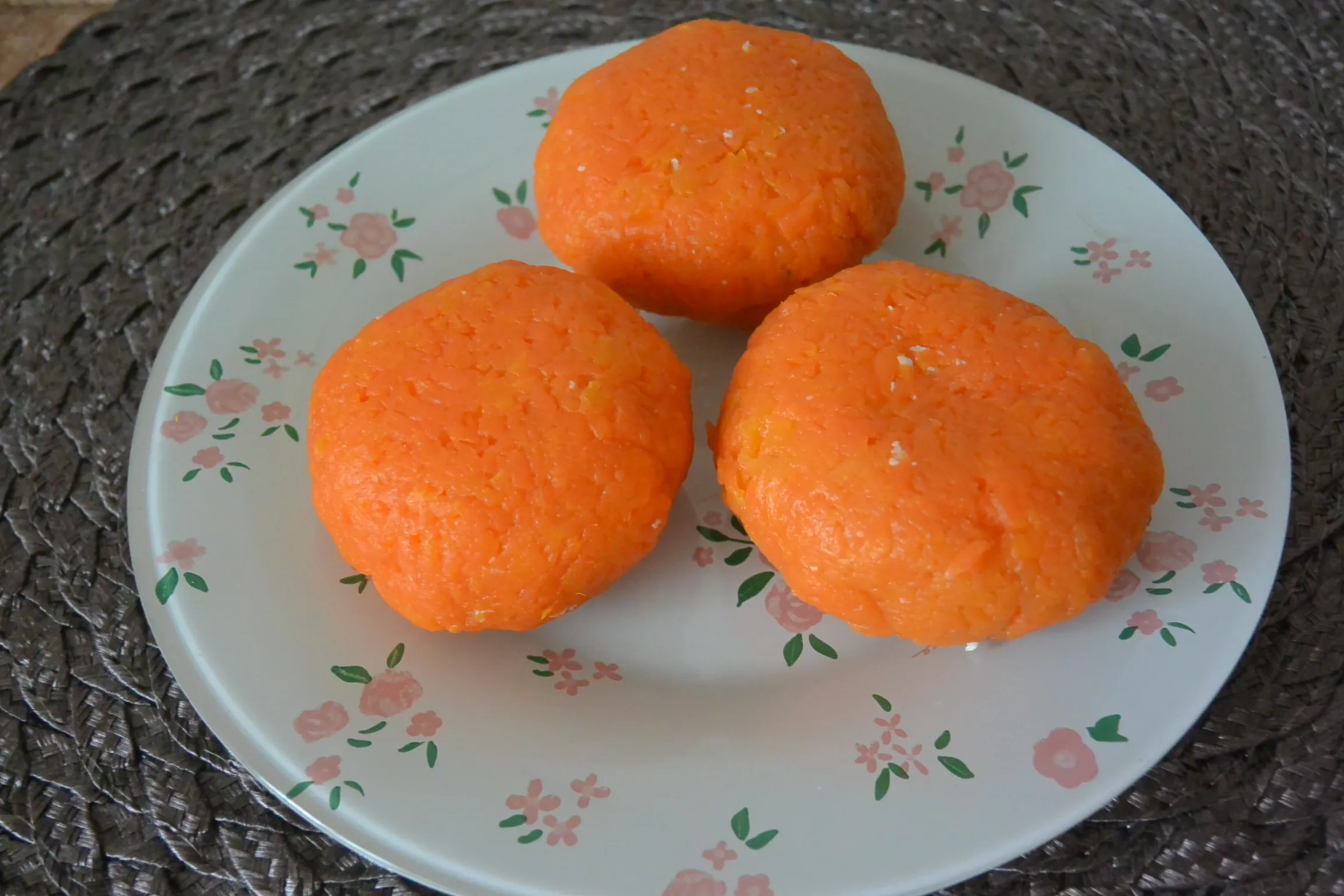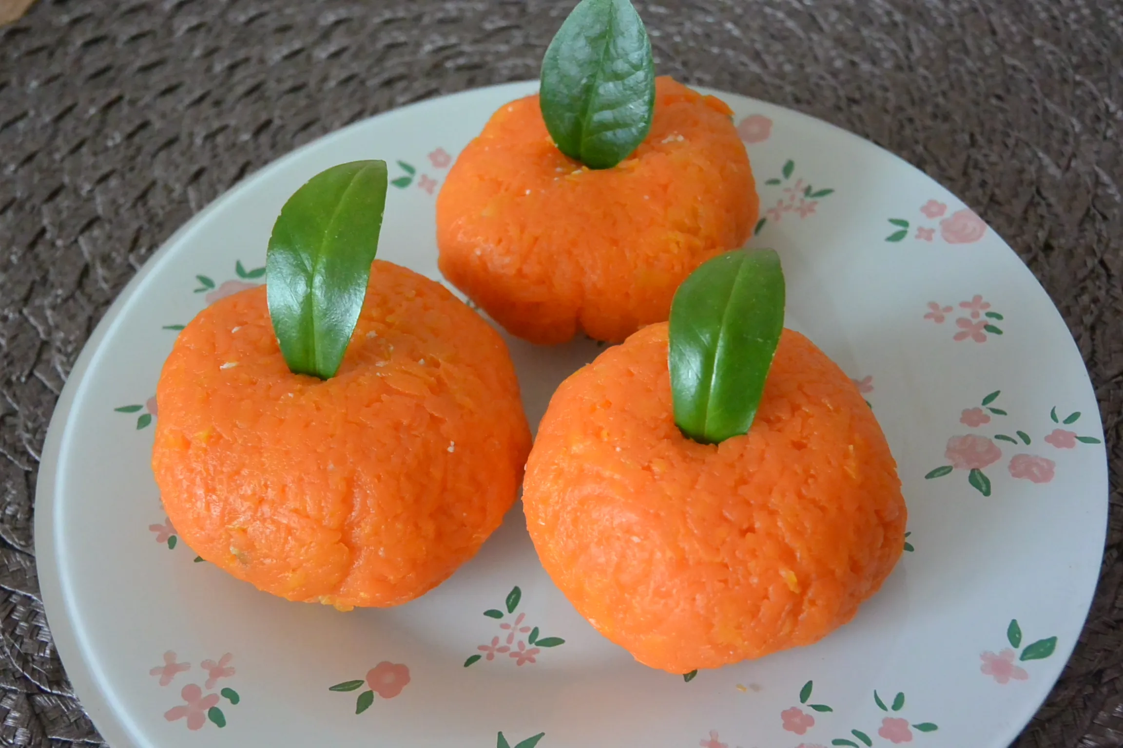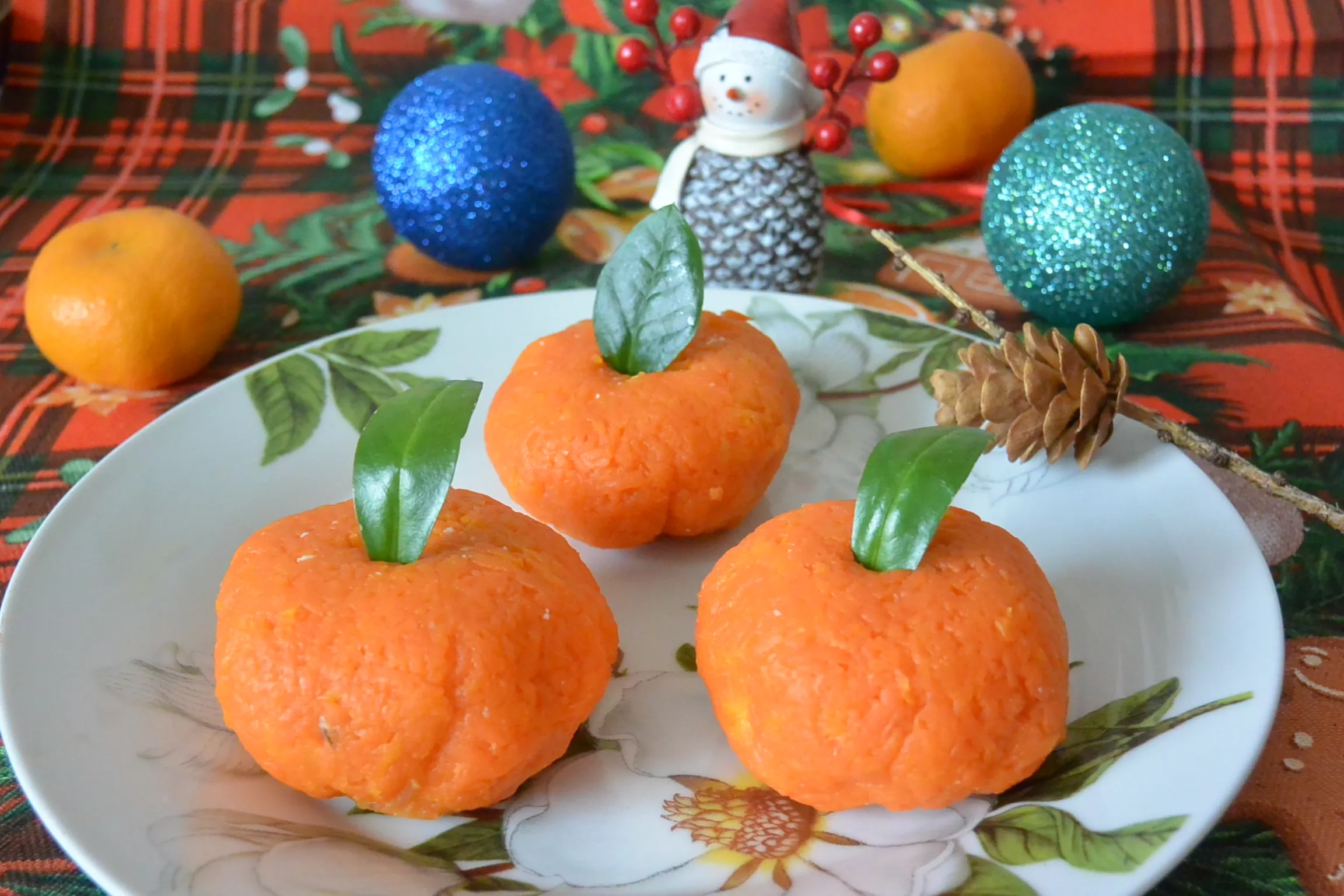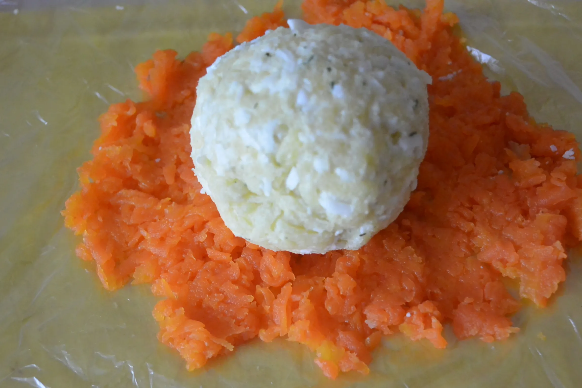 Сформируйте мандарины, используя пищевую плёнку. Шарики должны быть полностью покрыты морковью.
