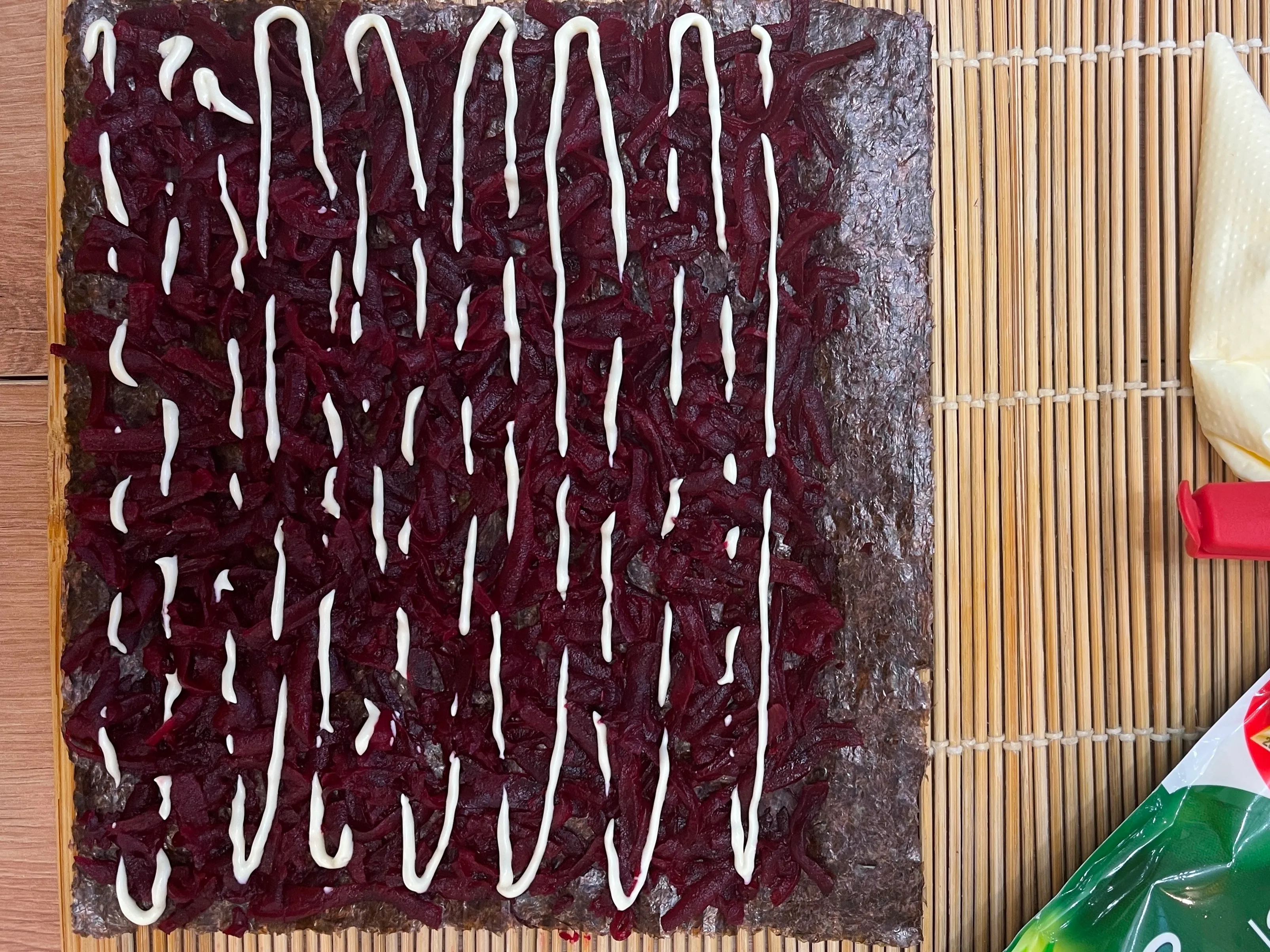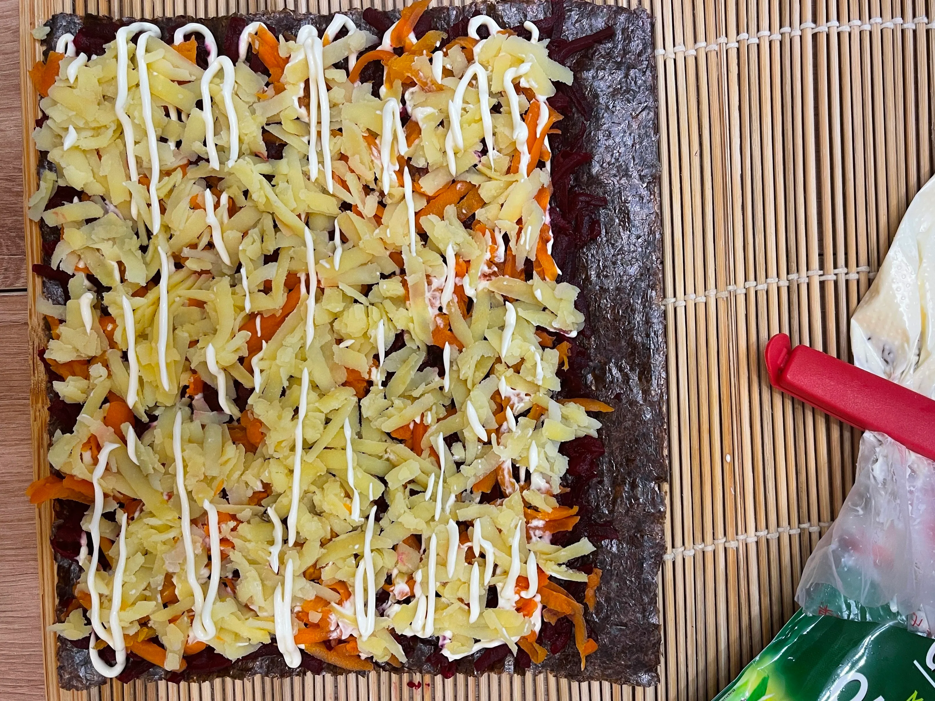 Натрите на тёрке в разные чашки картофель, морковь, свёклу. Возьмите лист нори и выложите на коврик или пищевую плёнку, первым слоем распределите на нём тонкий слой свёклы, затем немного смажьте майонезом.