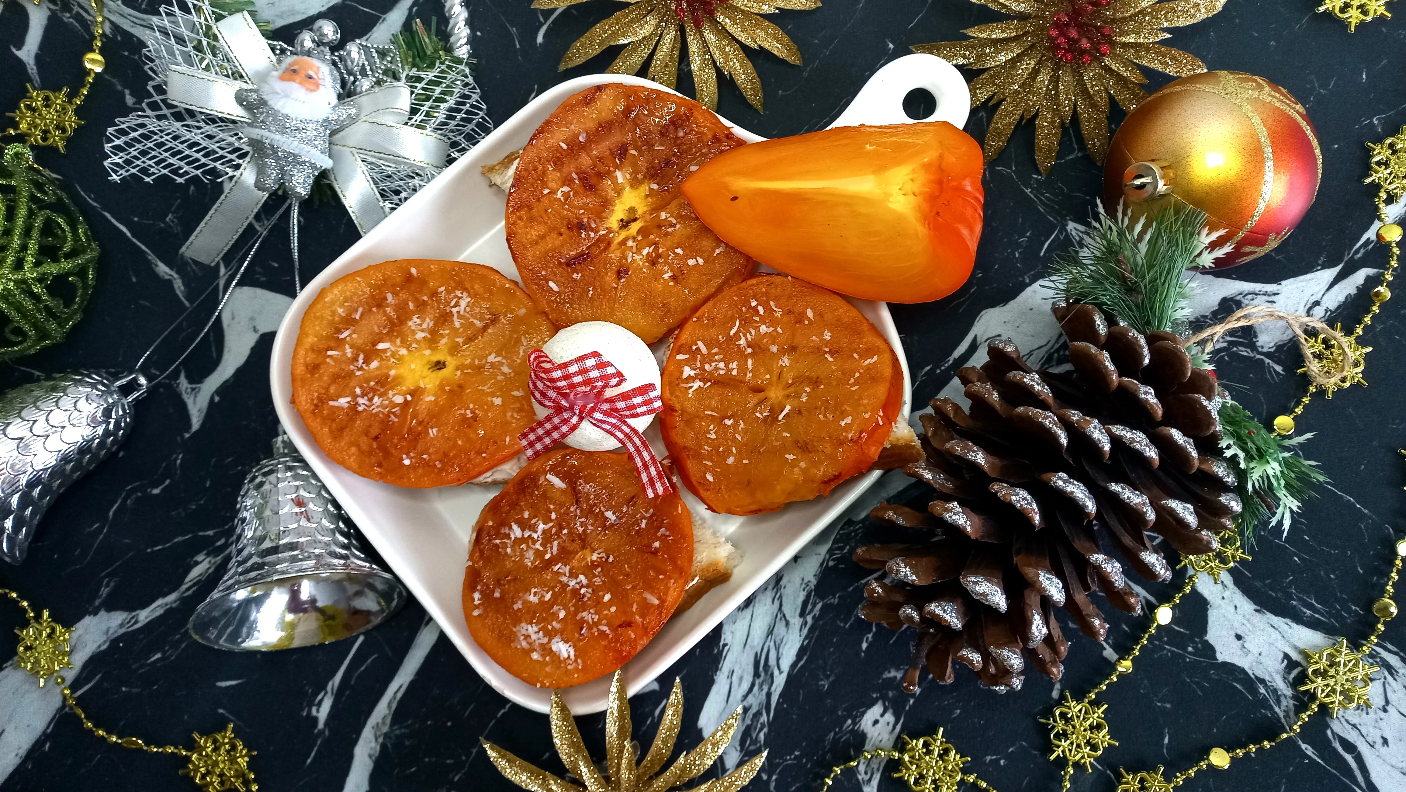 Красочный вид и яркий вкус хурмы на праздничном столе не останутся без внимания гостей. Жареная, сладкая хурма со слегка солёным сыром на хрустящем багете удивит волшебным вкусом.