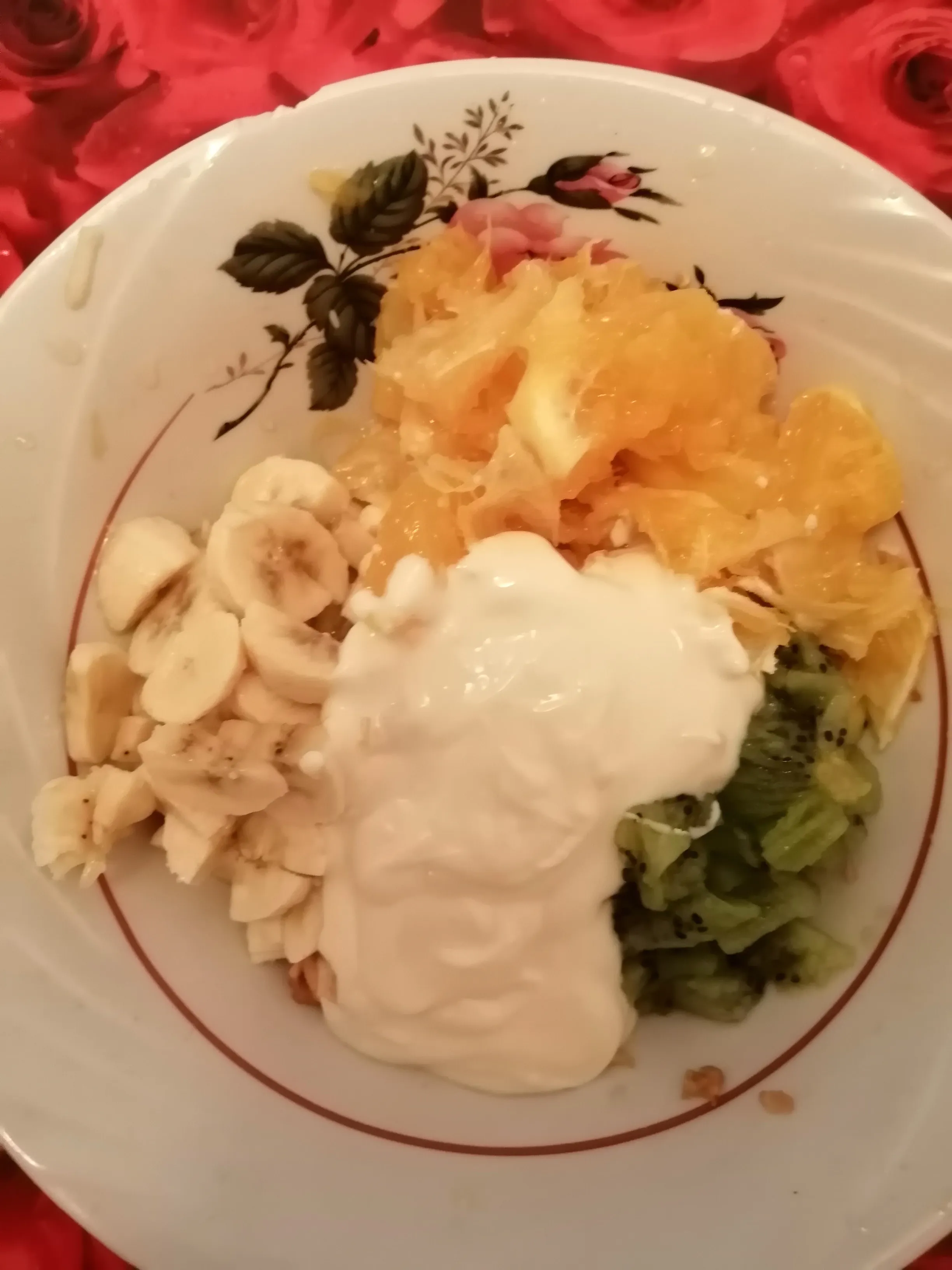 Яблоко натрите на крупной тёрке. Нарежьте банан и киви. Выложите всё в тарелку.