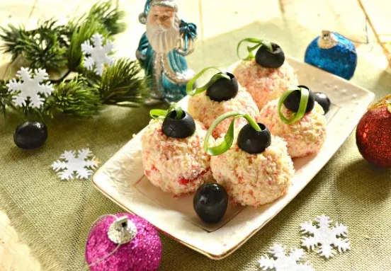 В отверстие половинки маслины проденьте верёвочку из лука. Маслину поместите на шарик. Новогодняя закуска из крабовых палочек и сыра «Ёлочные шары» готова!