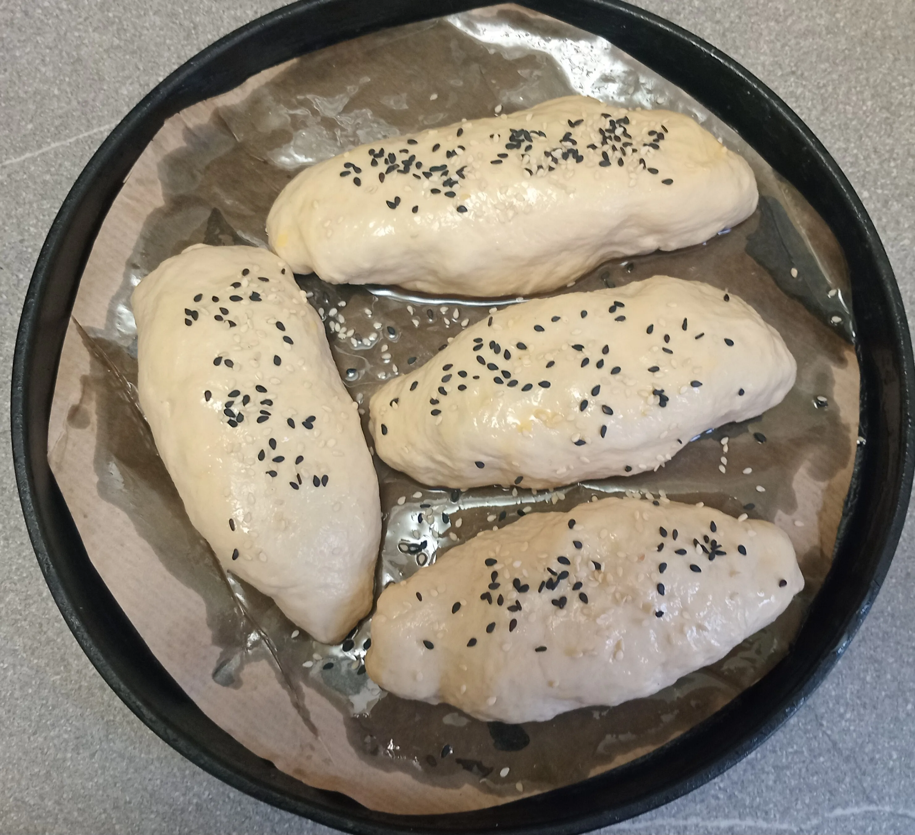 Смажьте пирожки белком и посыпьте кунжутом. Выложите в смазанную растительным маслом форму. Выпекайте 15 минут при температуре 170°C.