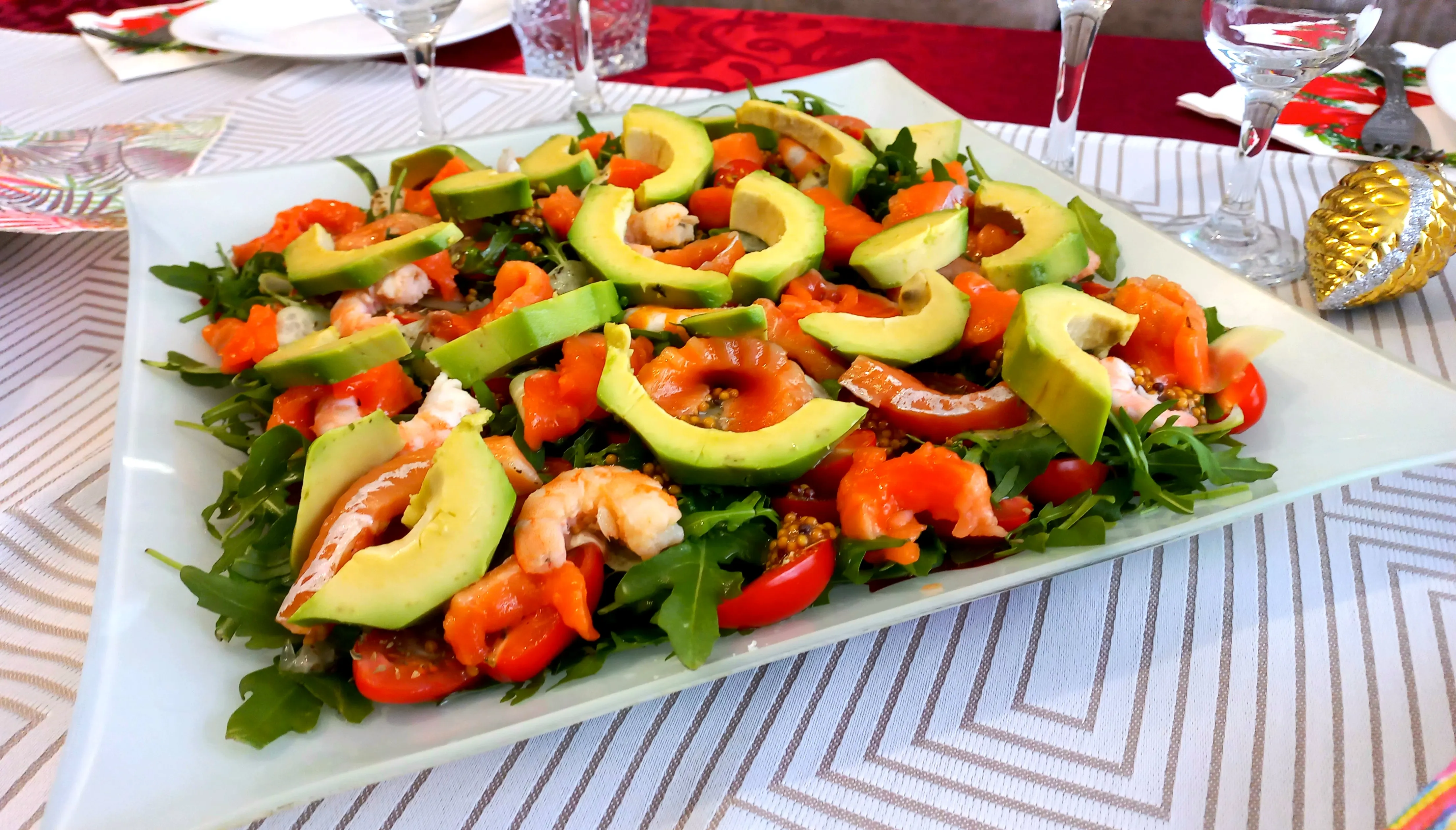 В тарелку с руколой выложите форель, креветки, черри. Равномерно полейте соусом и слегка встряхните ингредиенты. Выложите ломтики авокадо перед подачей на стол, чтобы не потемнели.