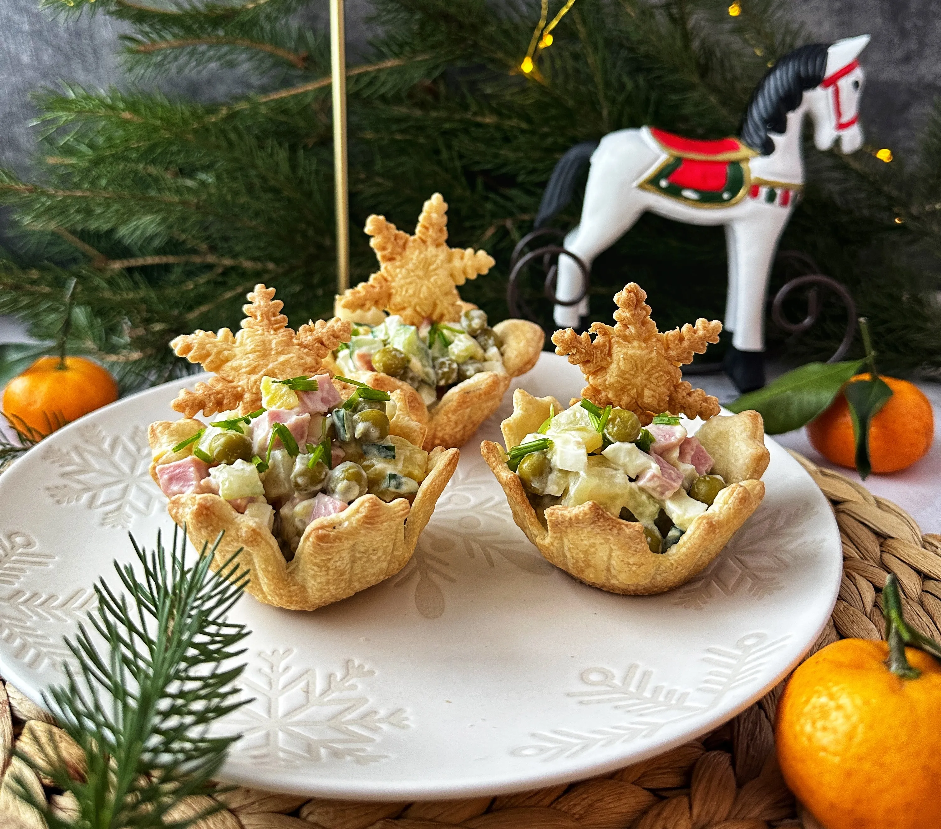 Оливье — это неотъемлемая часть новогоднего стола, но иногда хочется сделать банальное блюдо необычным. Попробуйте подать салат в тарталетках-снежинках из слоёного теста.