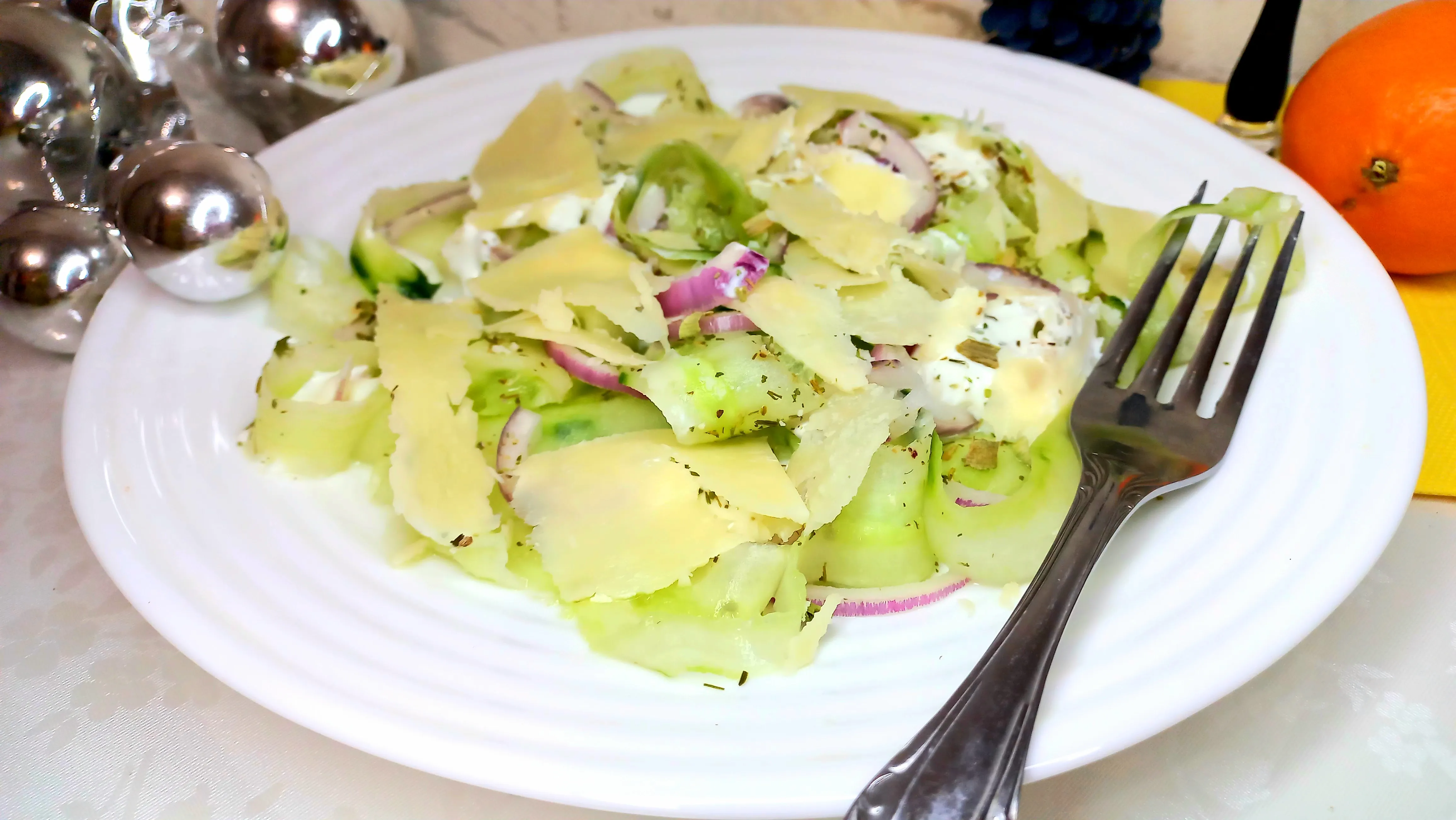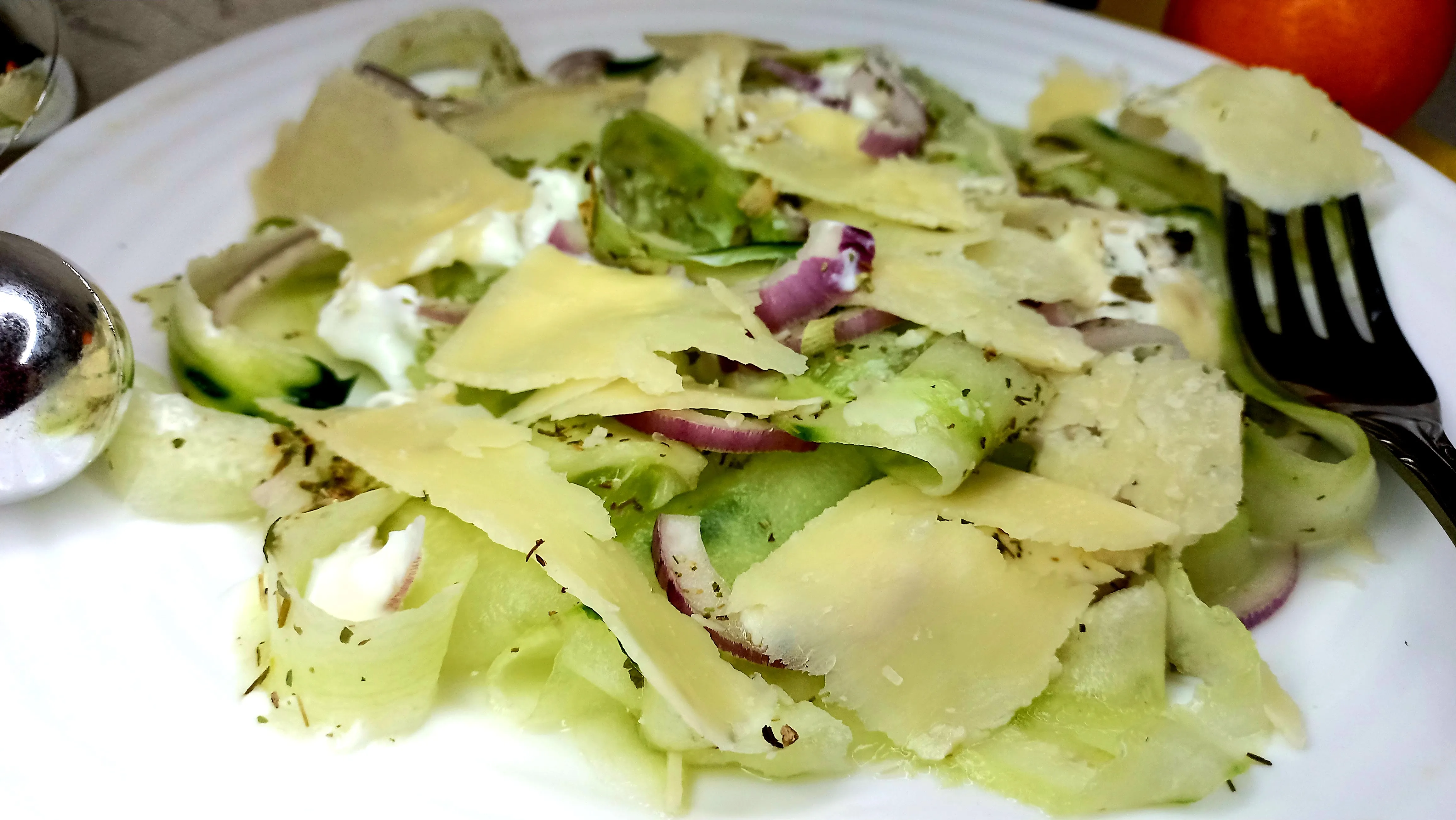 На тарелку выложите огуречные пластинки, немного их нужно свернуть. Затем полукольца красного лука. По чуть-чуть по всему салату добавьте греческий йогурт. Посолите и посыпьте французскими травами. Сверху поместите «лепестки» Пармезана.