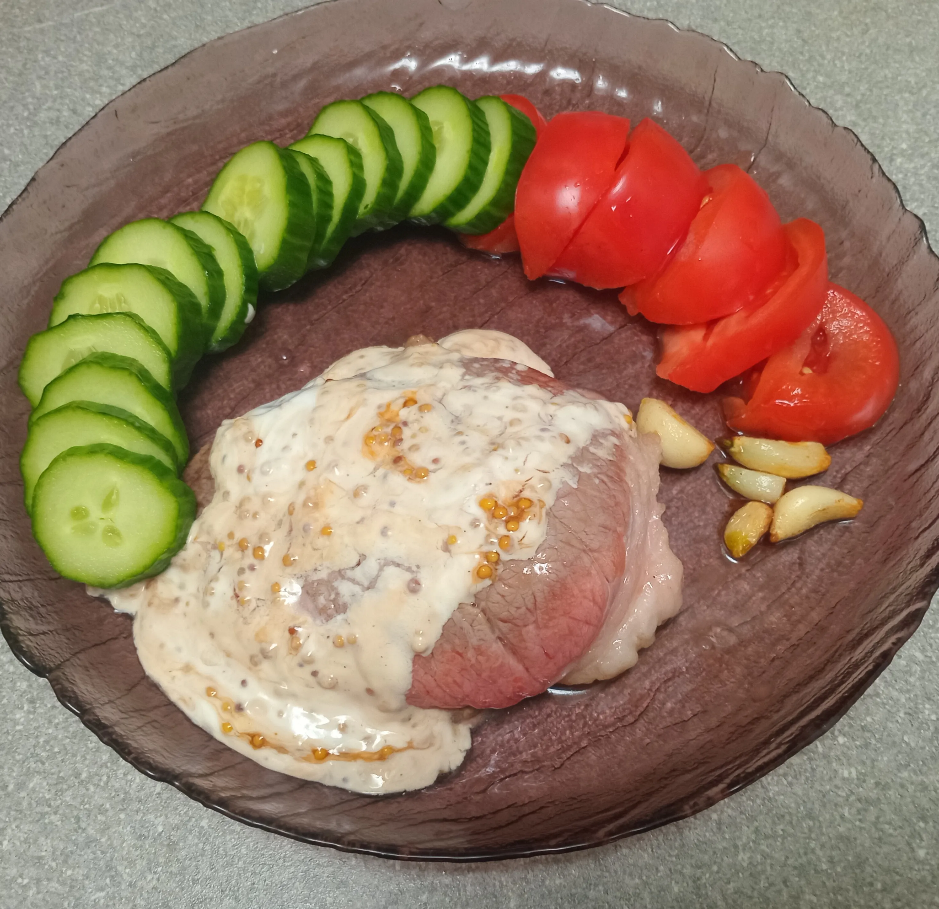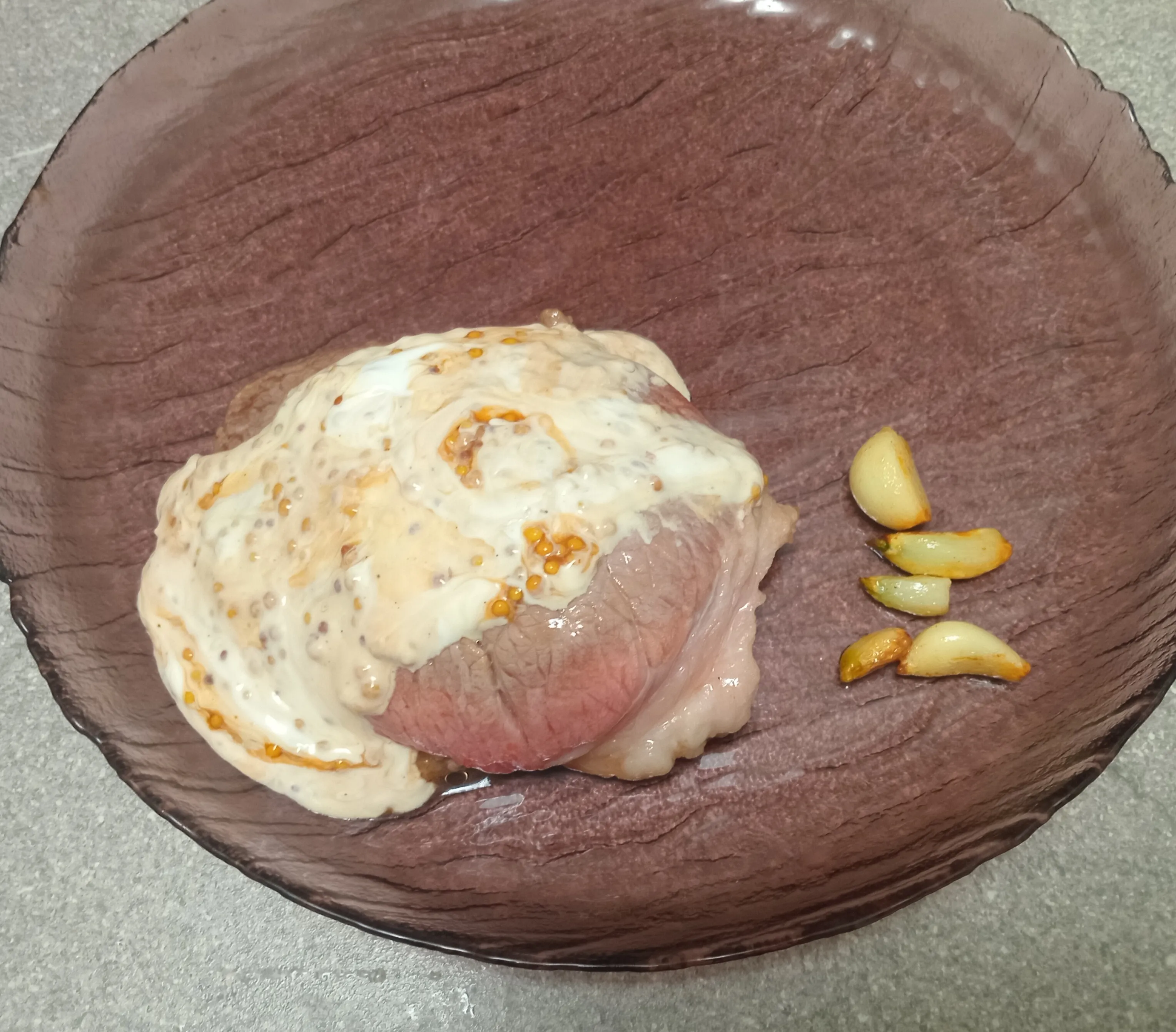 Стейк говяжий 200 гСметана 12% 40 гЧеснок 5 зубчик(а)Масло оливковое 1 ст.л.Горчица зернистая 25 г