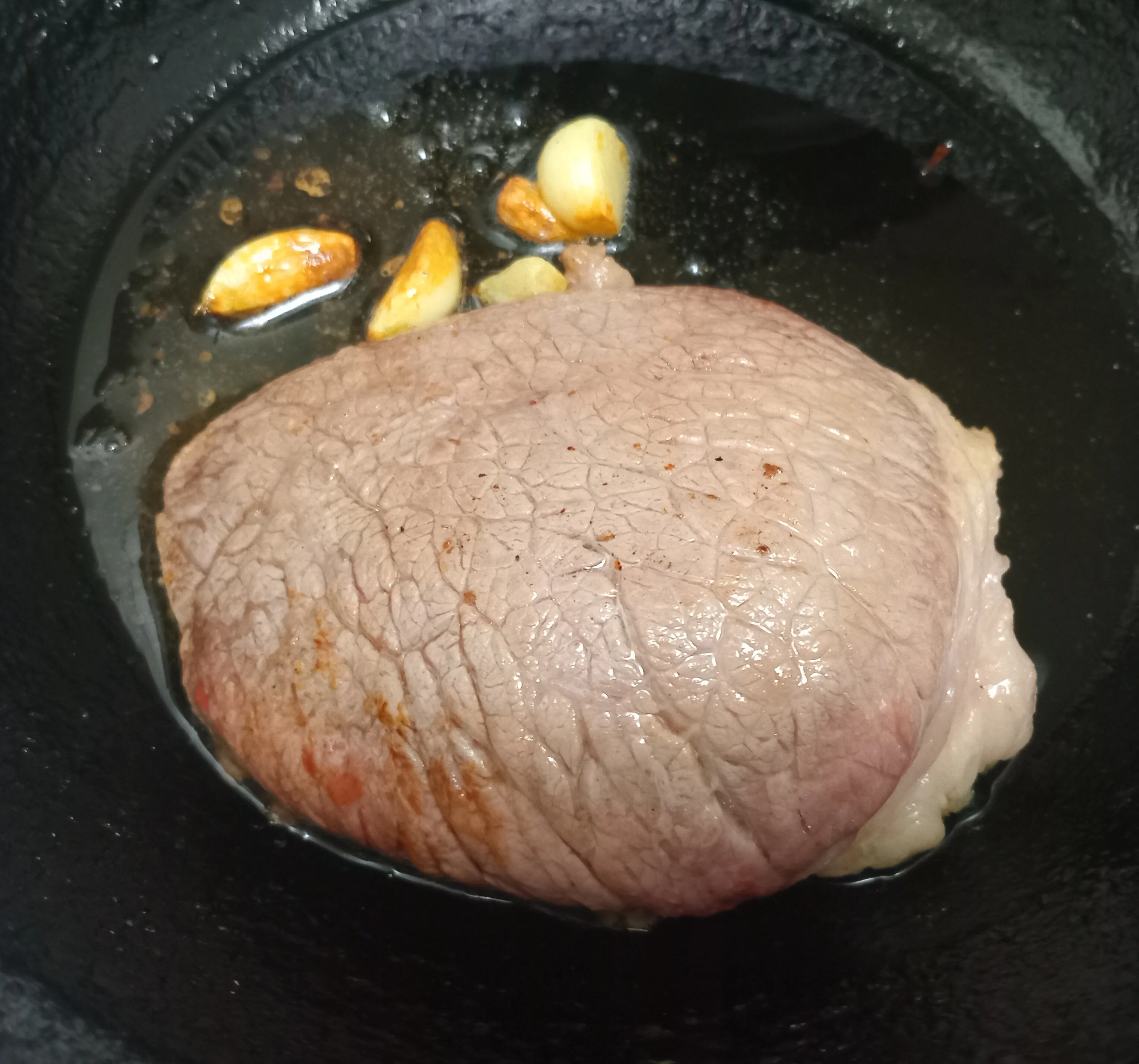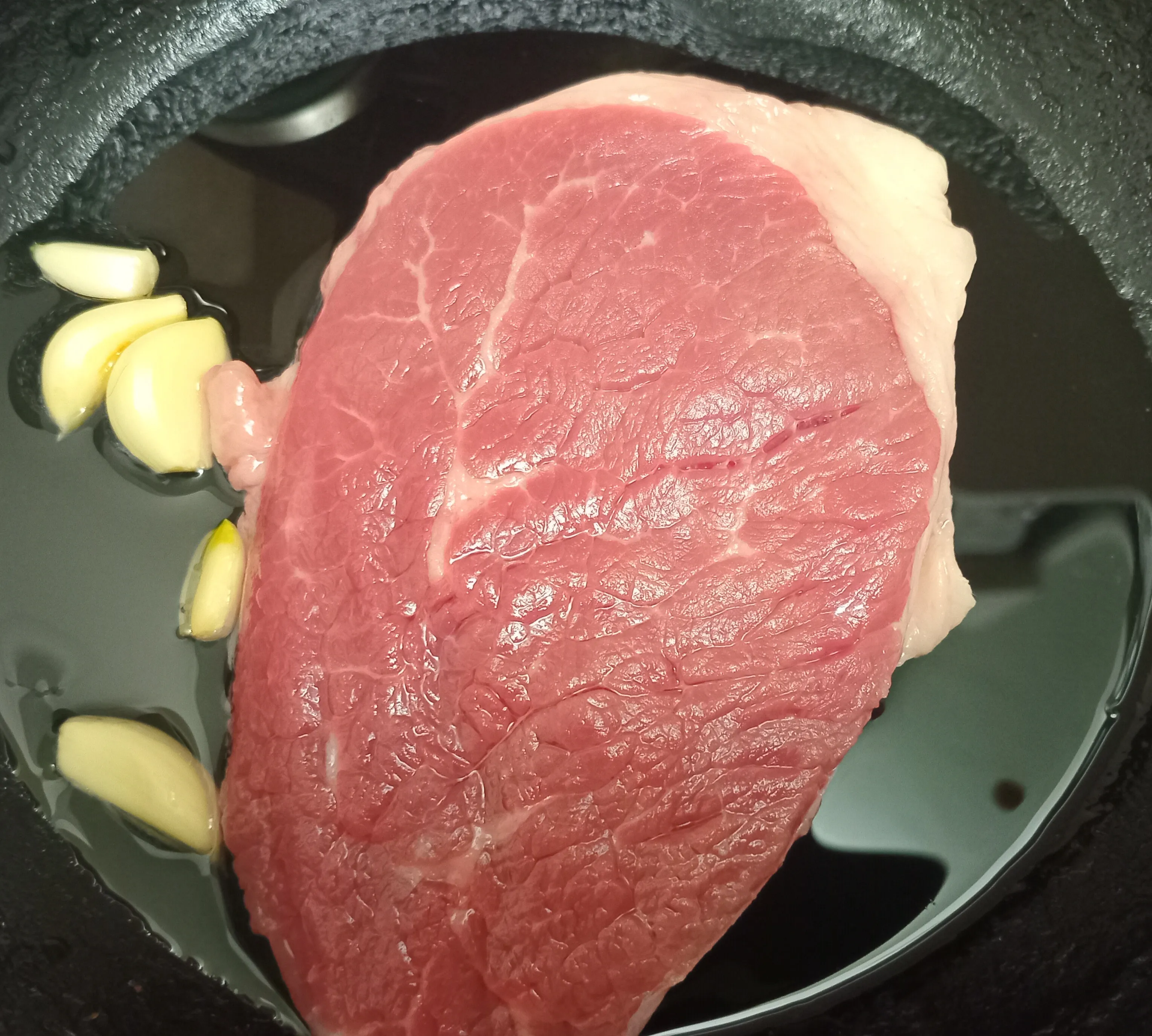Стейк и очищенный чеснок выложите на раскалённую сковороду с налитым оливковым маслом.