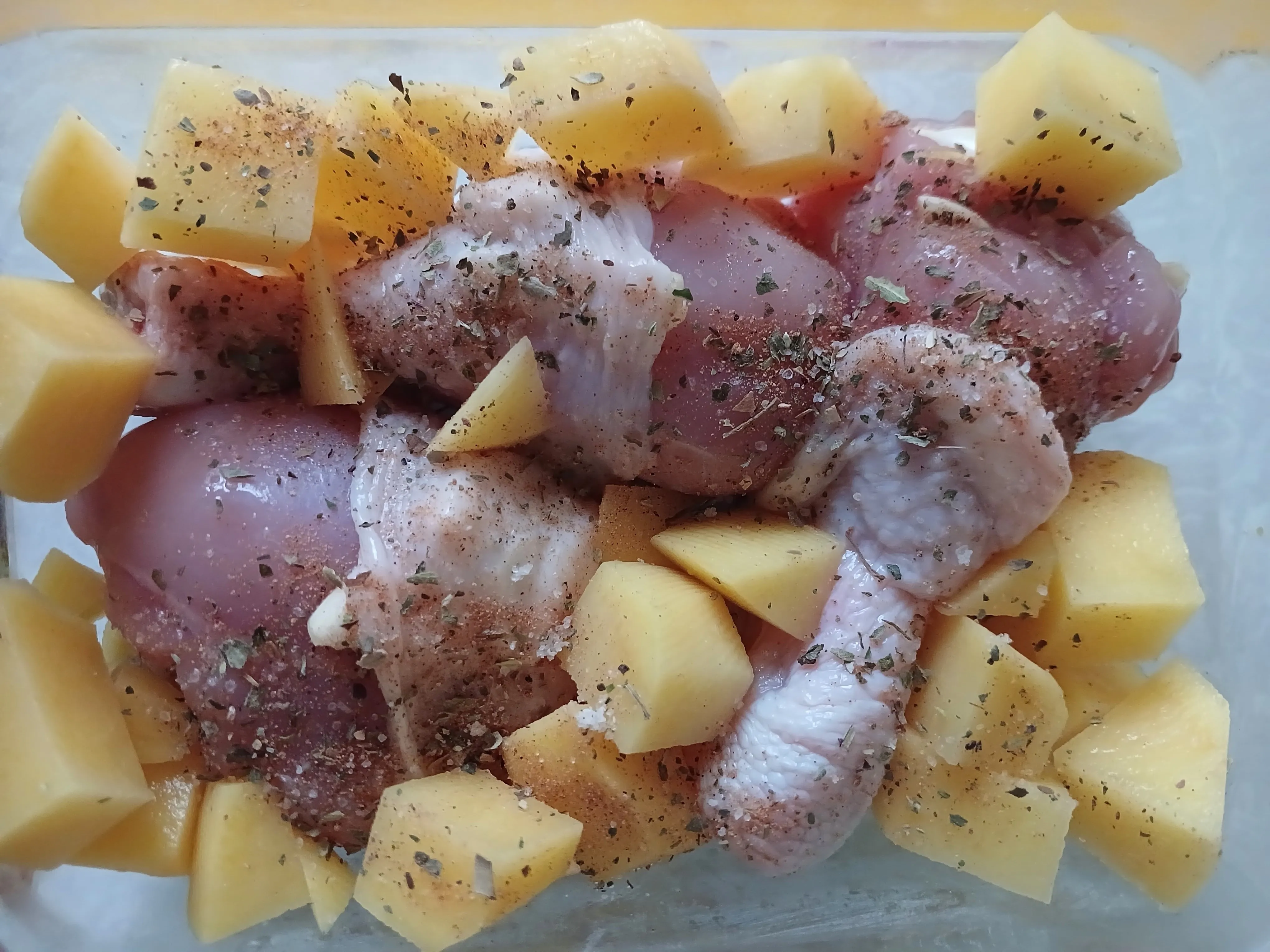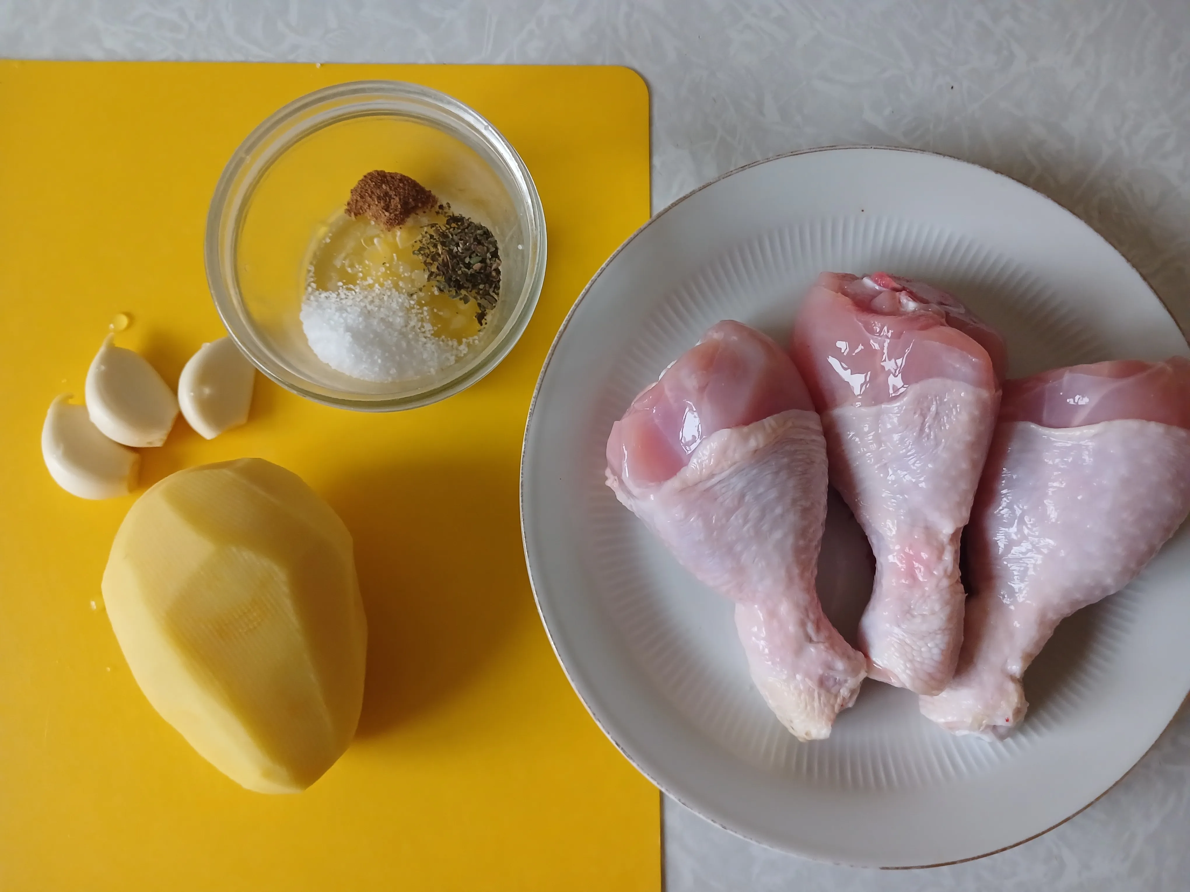 Разделайте курицу на порционные кусочки, подойдут три небольших голени. Картофель и чеснок почистите и помойте.
