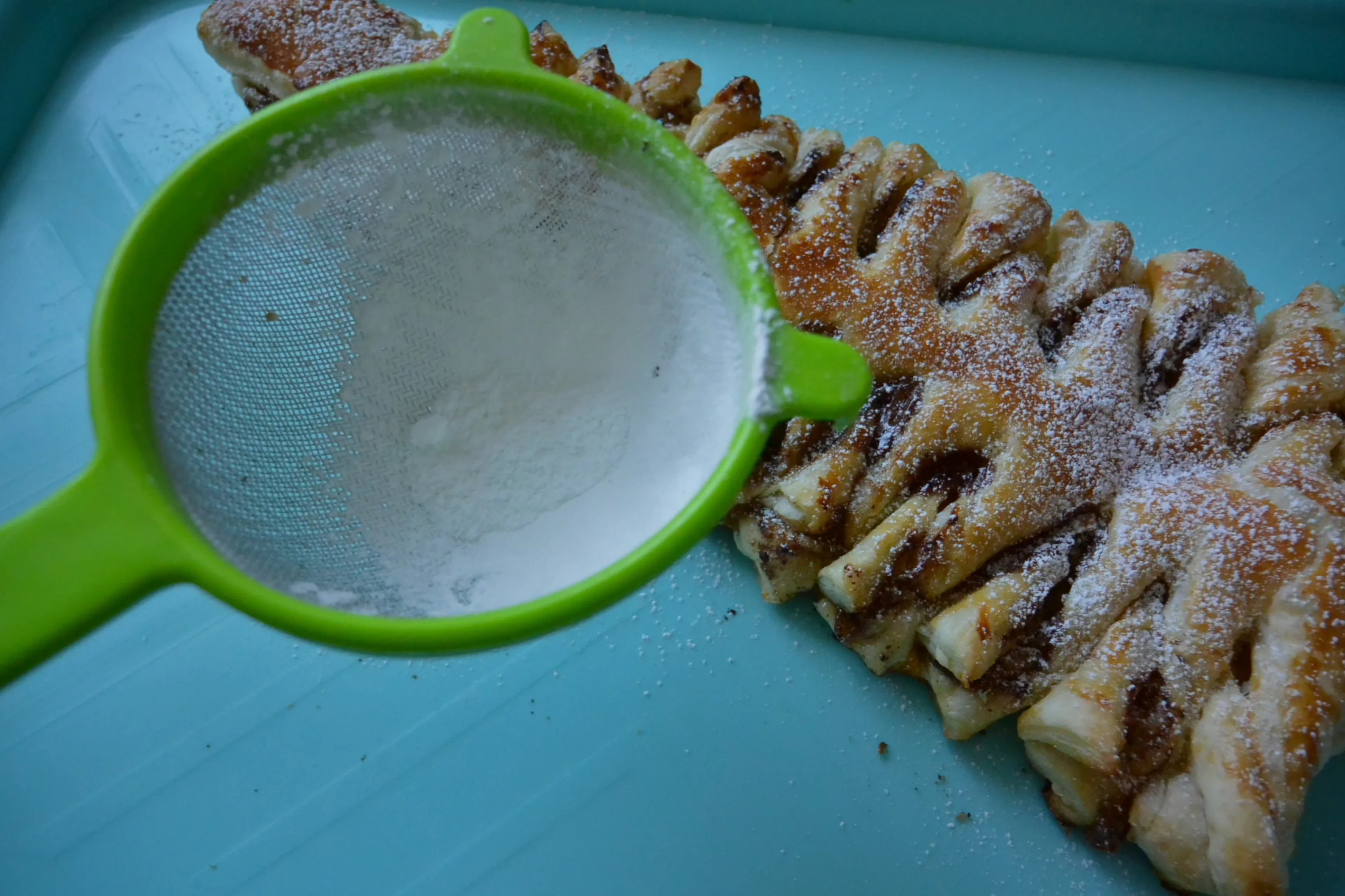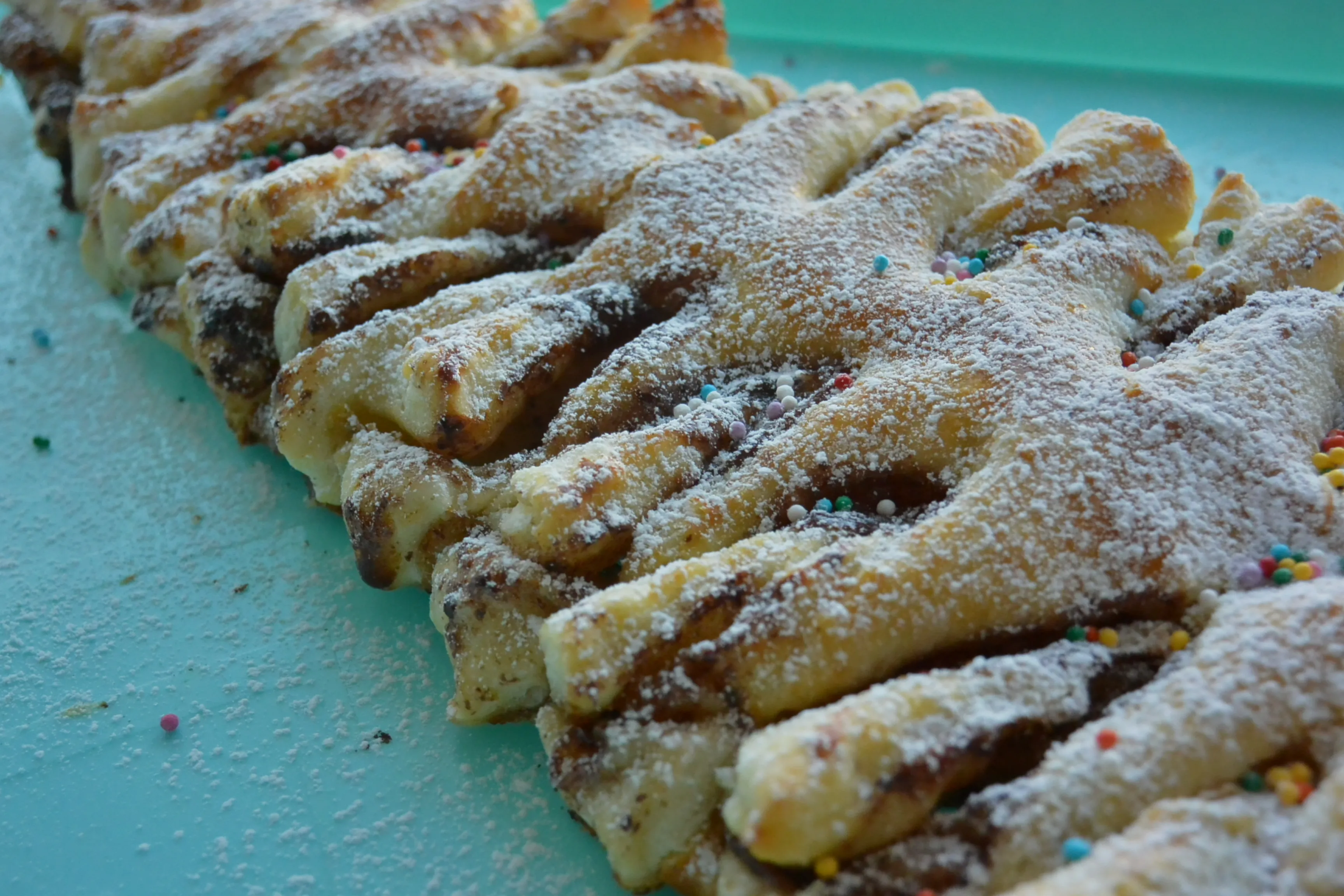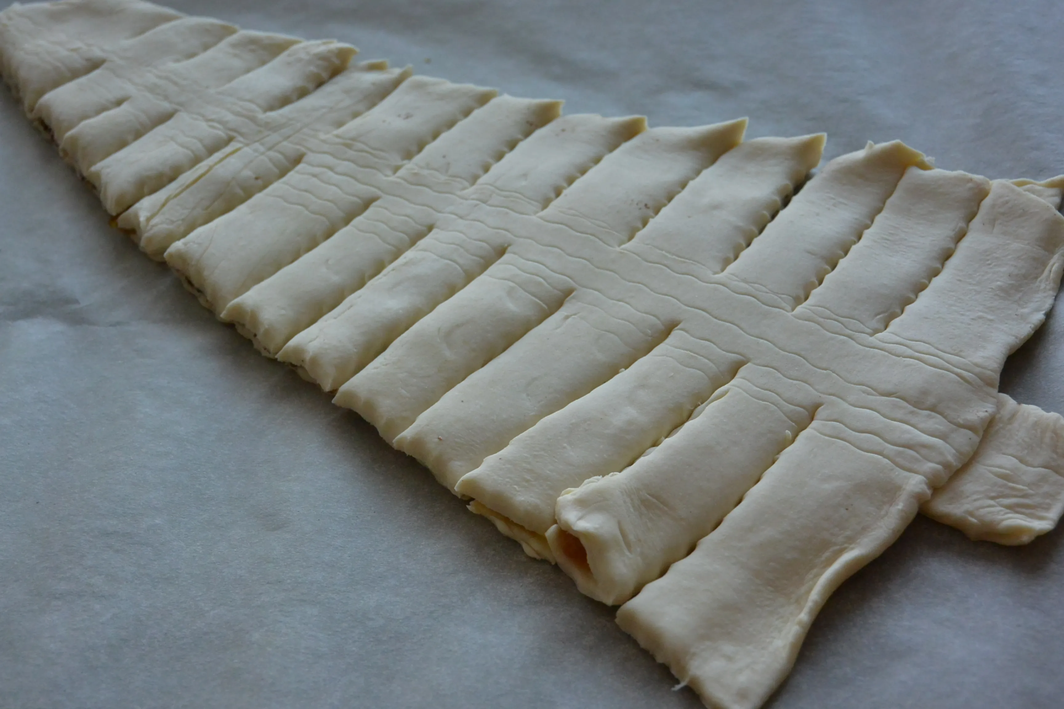 Разрежьте 2 пласта слоёного теста, как показано на фото, в виде ёлочки. Один пласт смажьте джемом и положите сверху второй пласт.