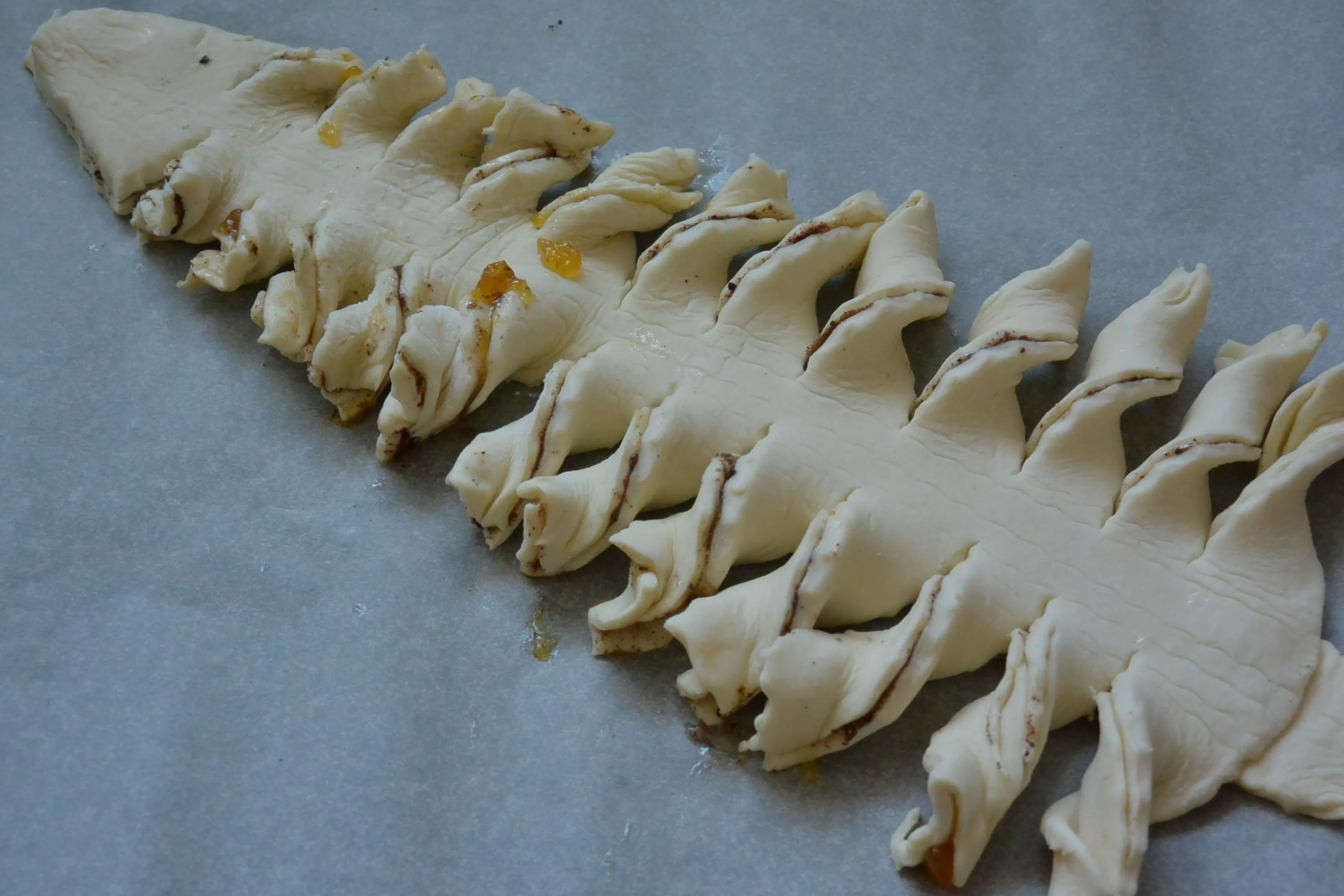 Боковые разрезы заверните с двух сторон. Смажьте ёлочку яичным желтком.