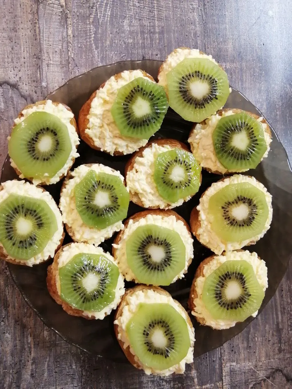 Багет намажьте готовой смесью. Украсьте бутерброды нарезанными кружочками киви (2 штуки). Приятного аппетита!