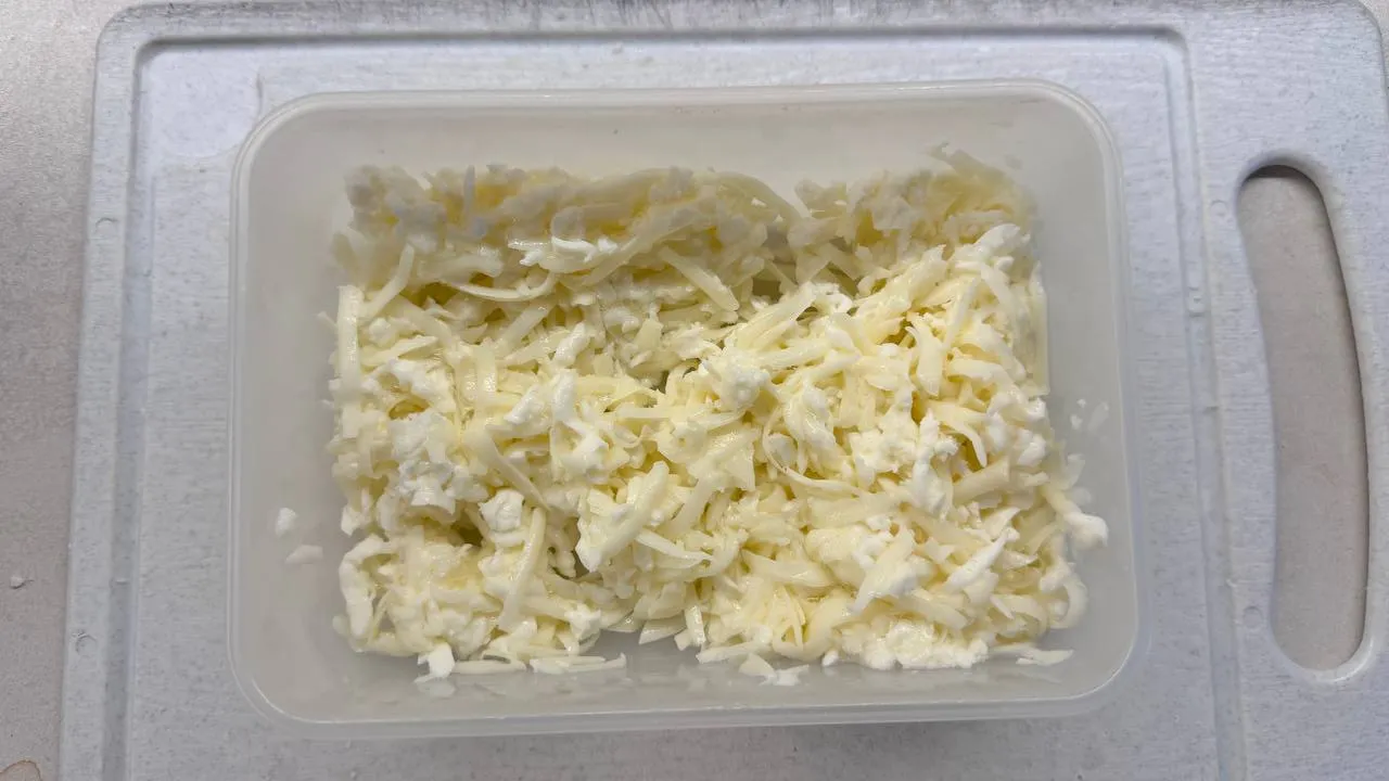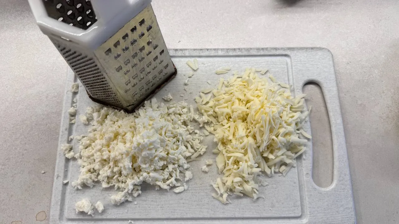 Натрите весь сыр на тёрке, перемешайте его в единую массу.