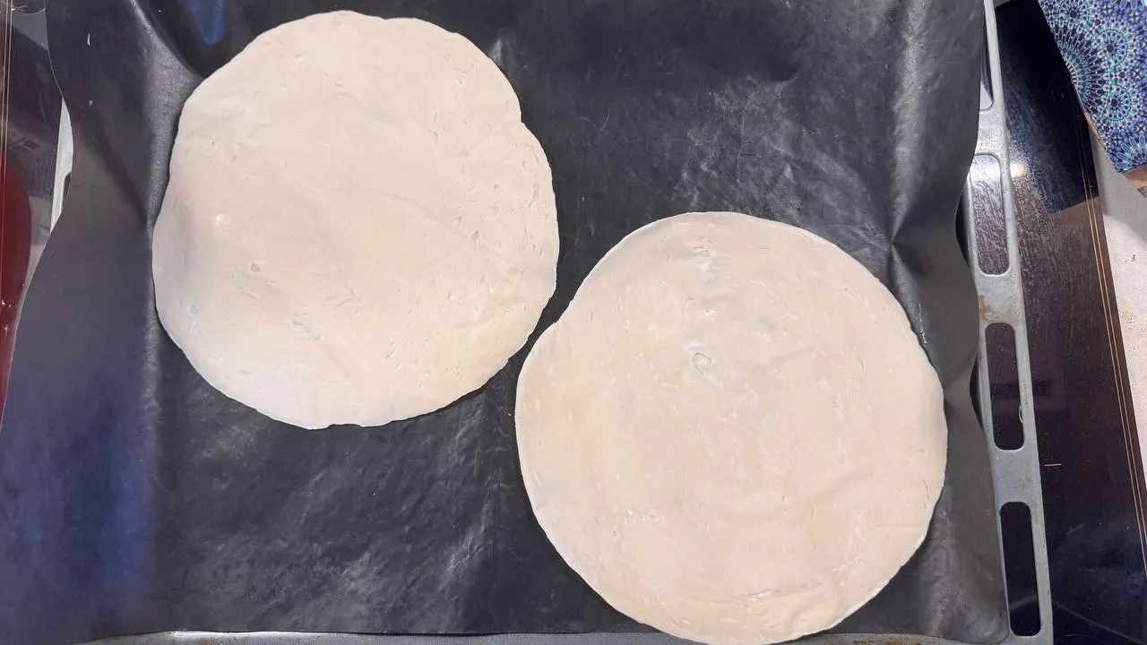 Достаньте замороженные лепёшки роти, отделите от упаковки, выложите на силиконовый коврик для разморозки. Потребуется примерно 7 минут, за это время сделайте начинку.