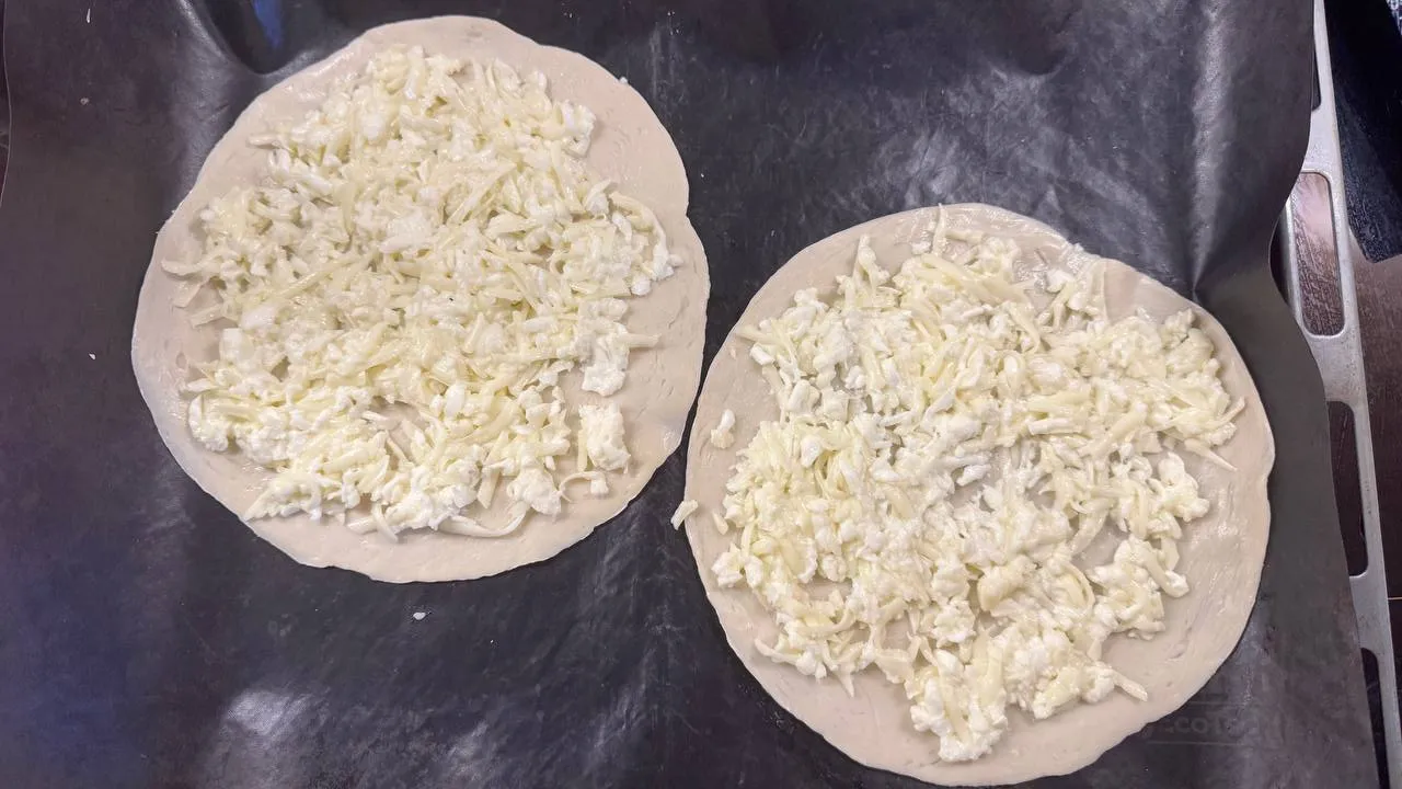 Когда лепёшки роти уже разморозились, выложите на них сыр, немного отступая от края.