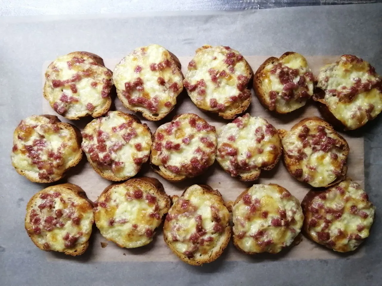 Нарежьте батон на ломтики и смажьте готовой смесью. Выложите на противень.