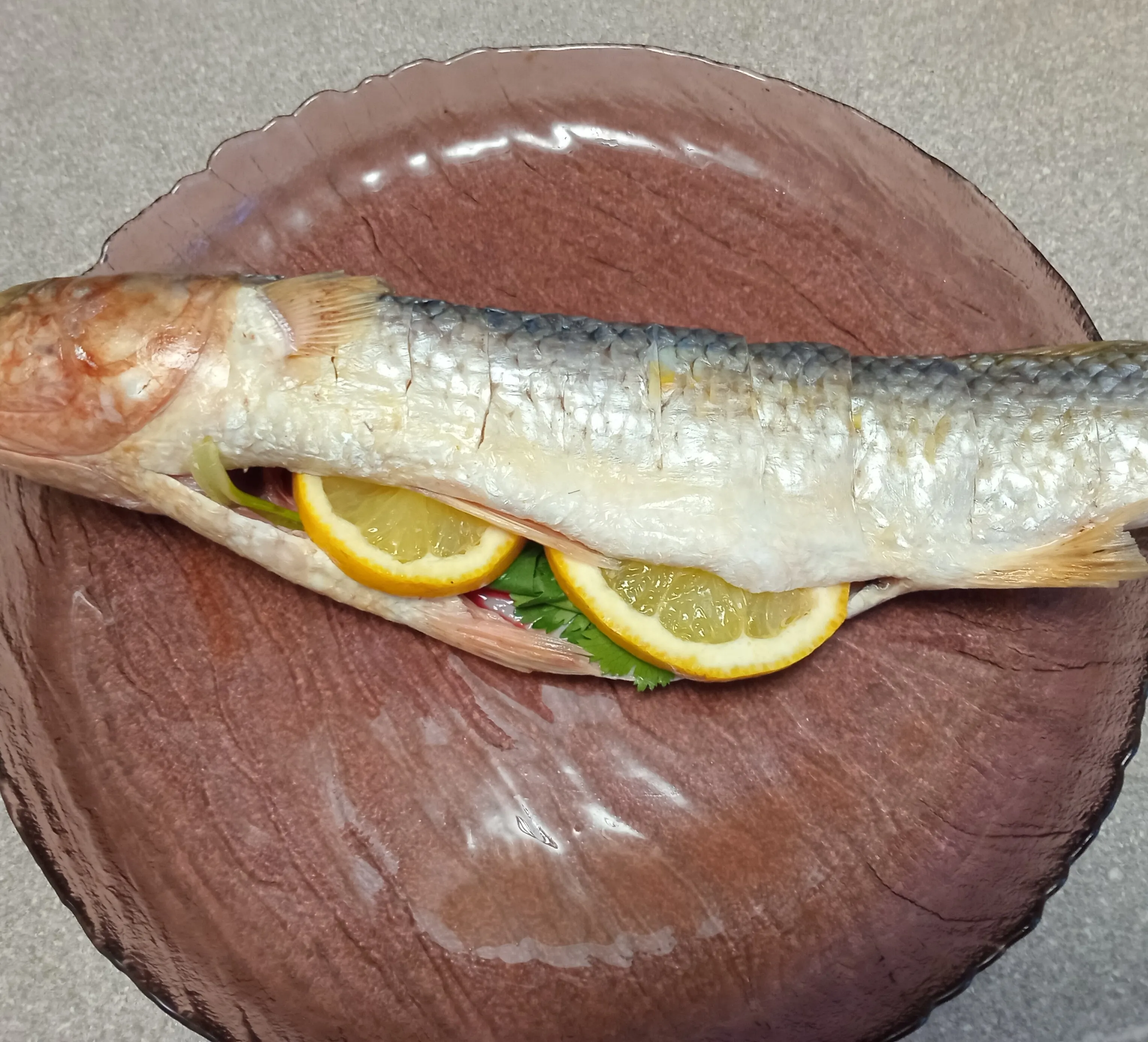 Лимон нарежьте ломтиками. Выложите в брюшко кефали пару ломтиков лимона и веточку петрушки.