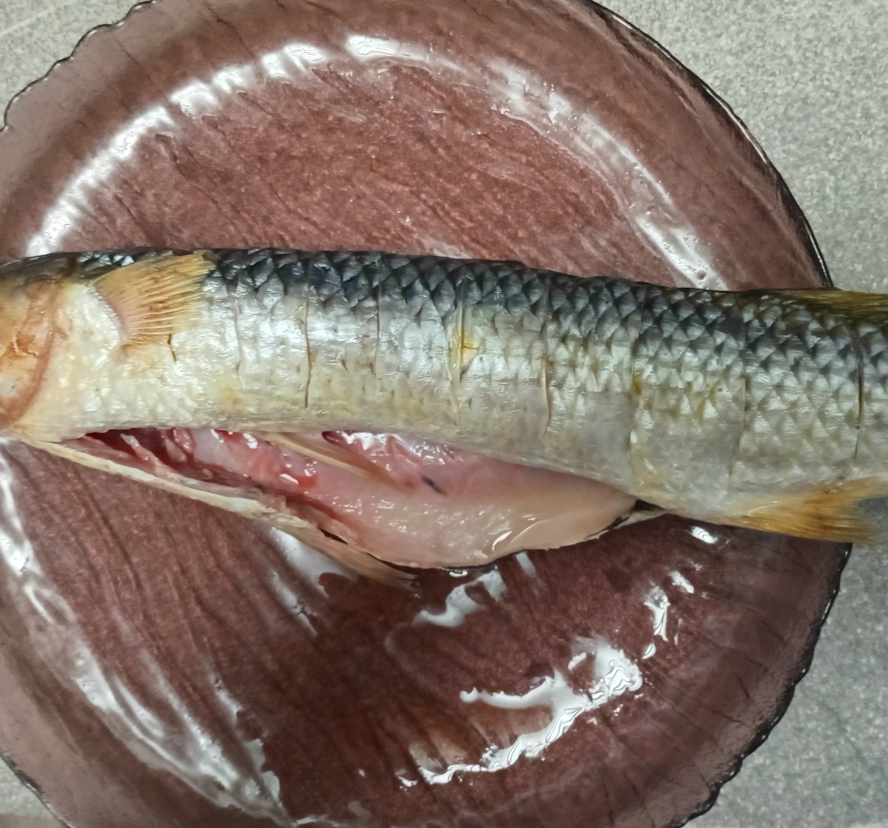У кефали удалите внутренности. Сделайте на рыбе надрезы ножом.