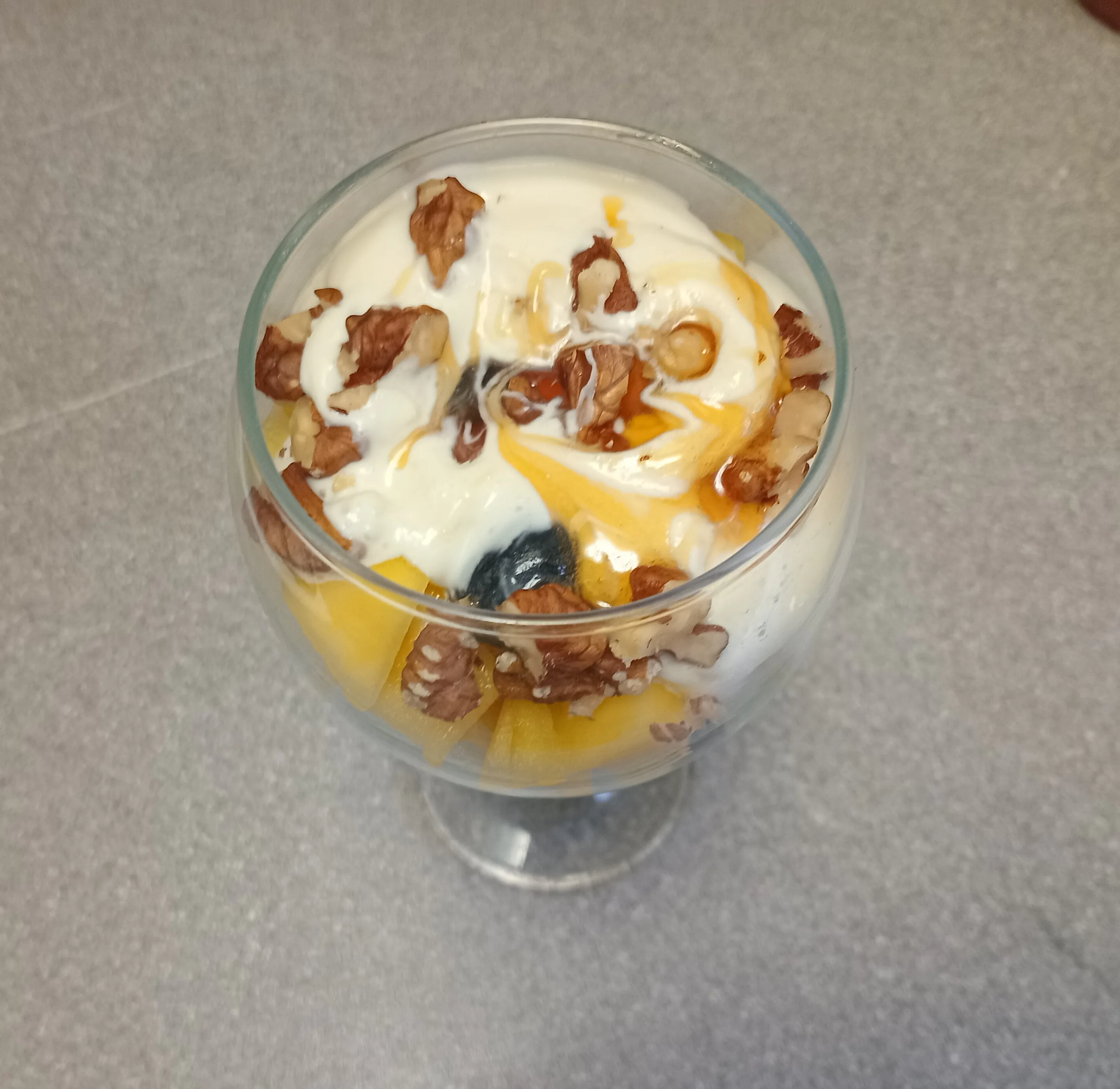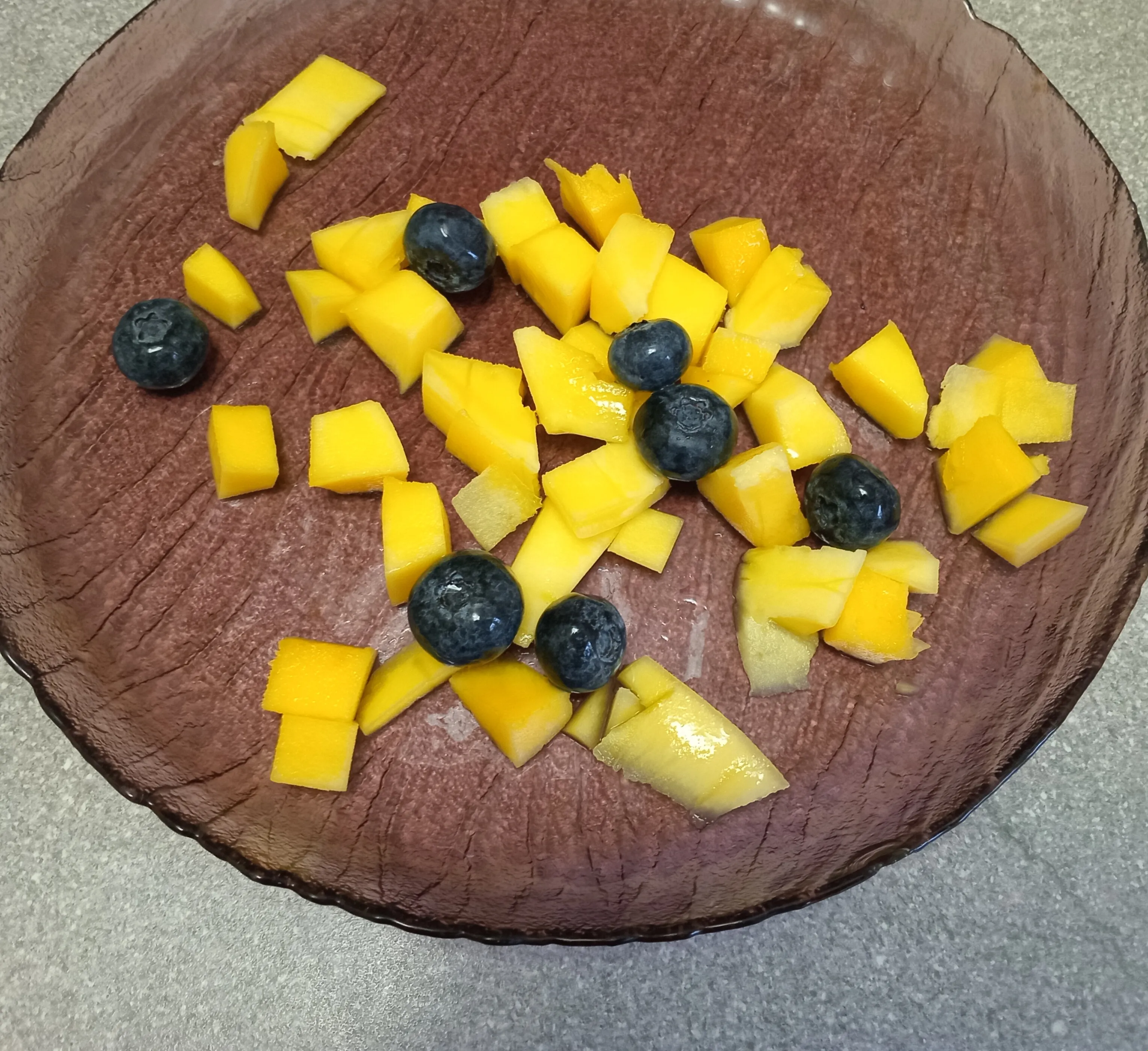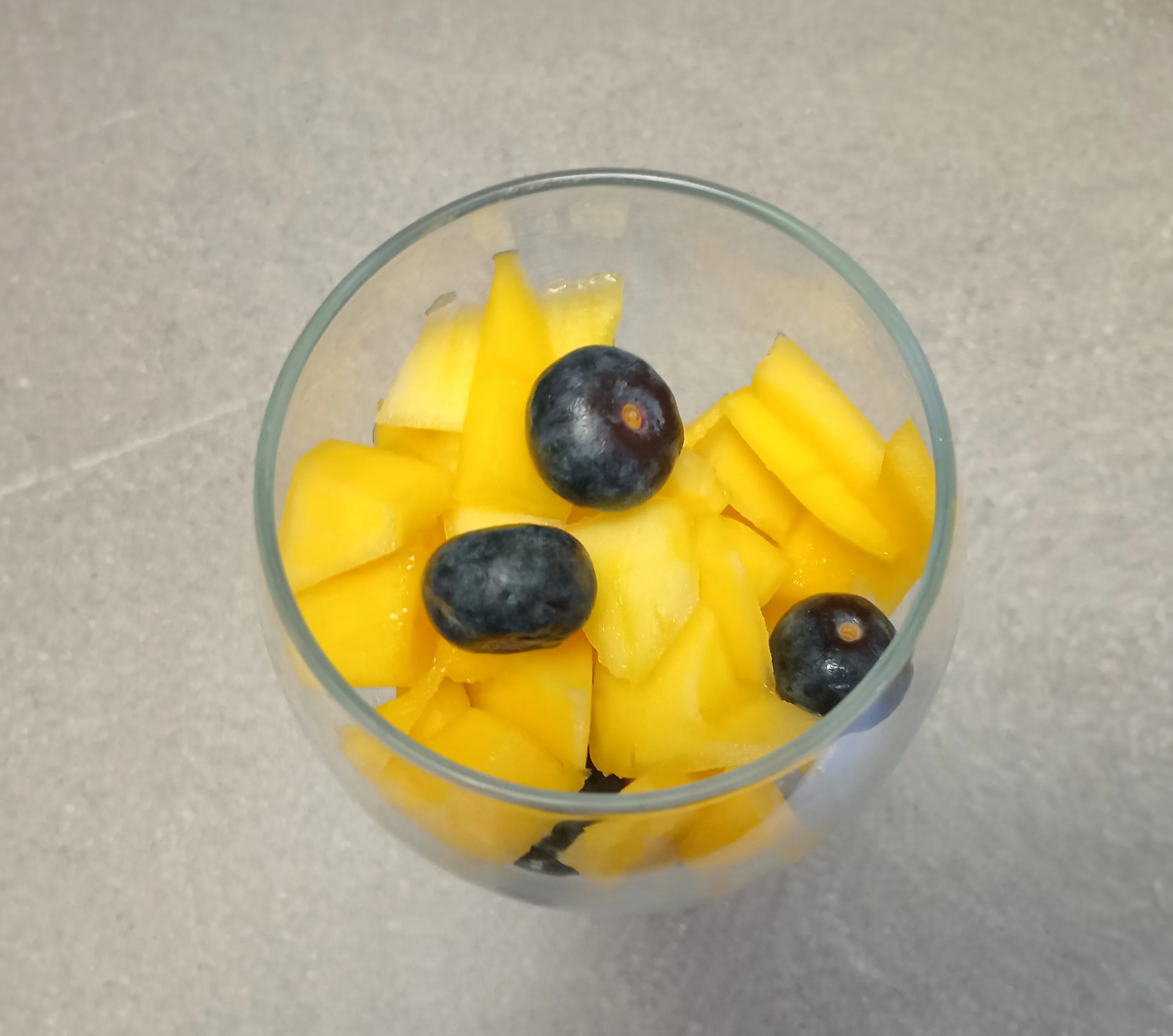 Подготовьте ингредиенты. Манго нарежьте кубиками. Добавьте голубику.