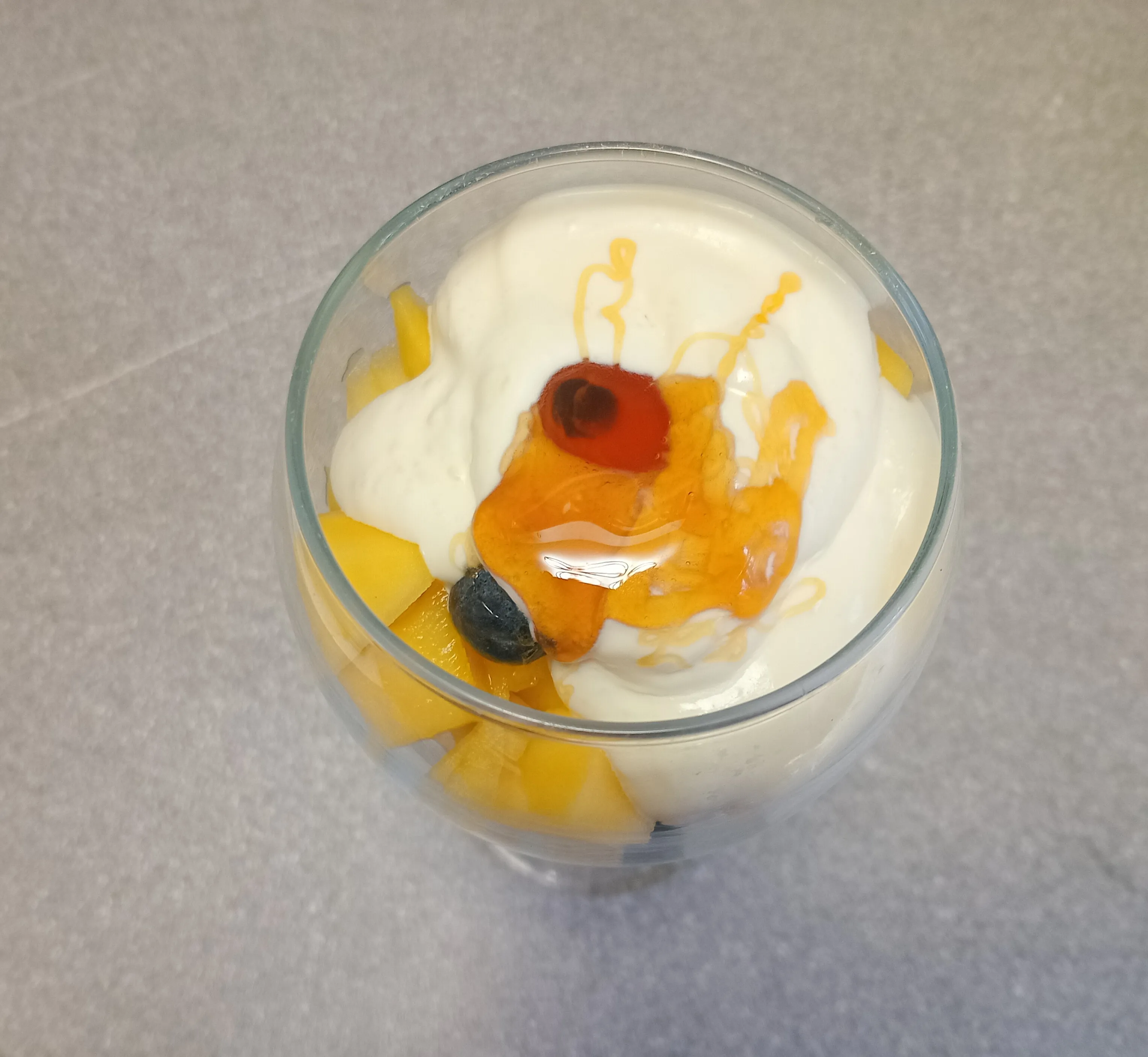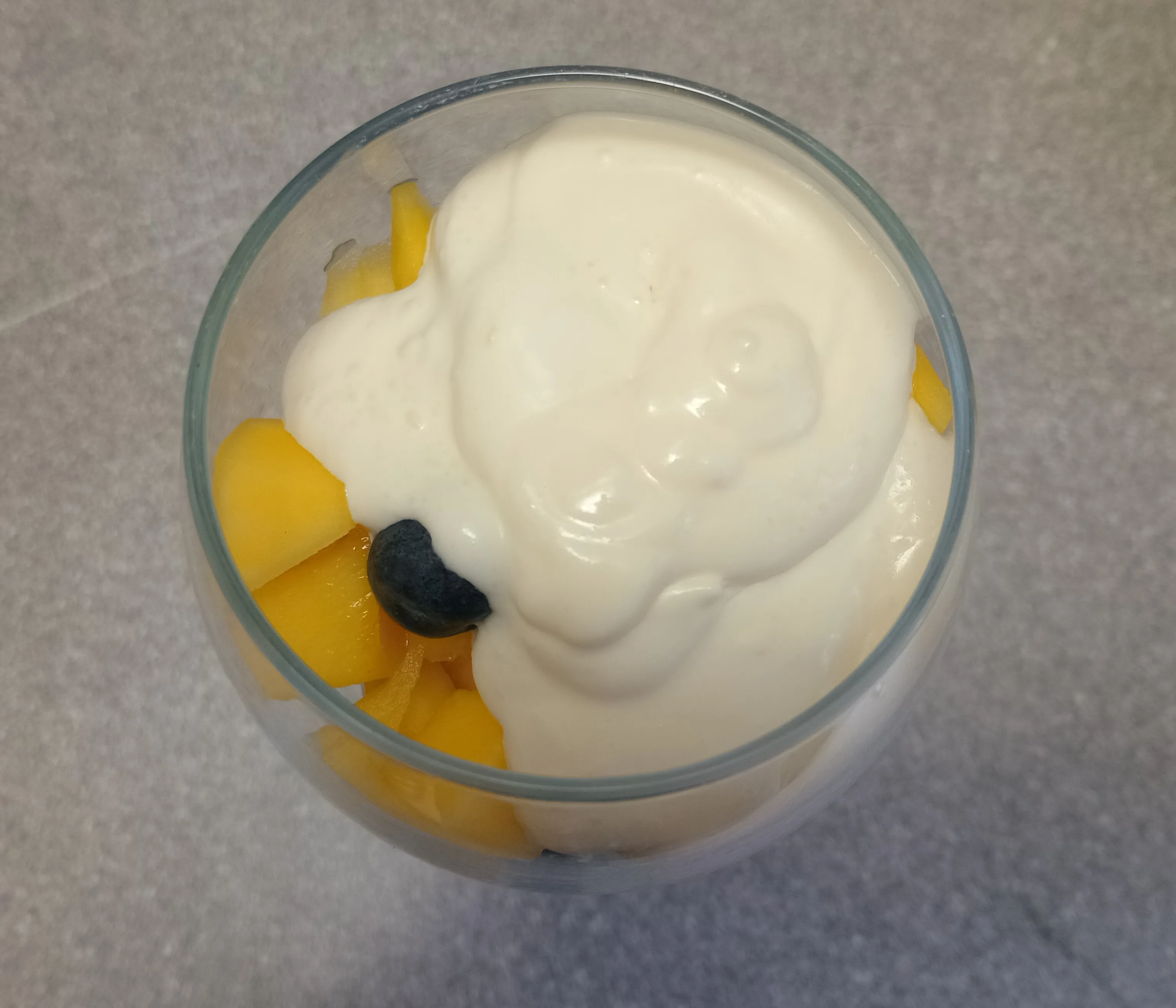 Сливки взбейте примерно в течении трёх минут. Выложите взбитые сливки на манго с голубикой.