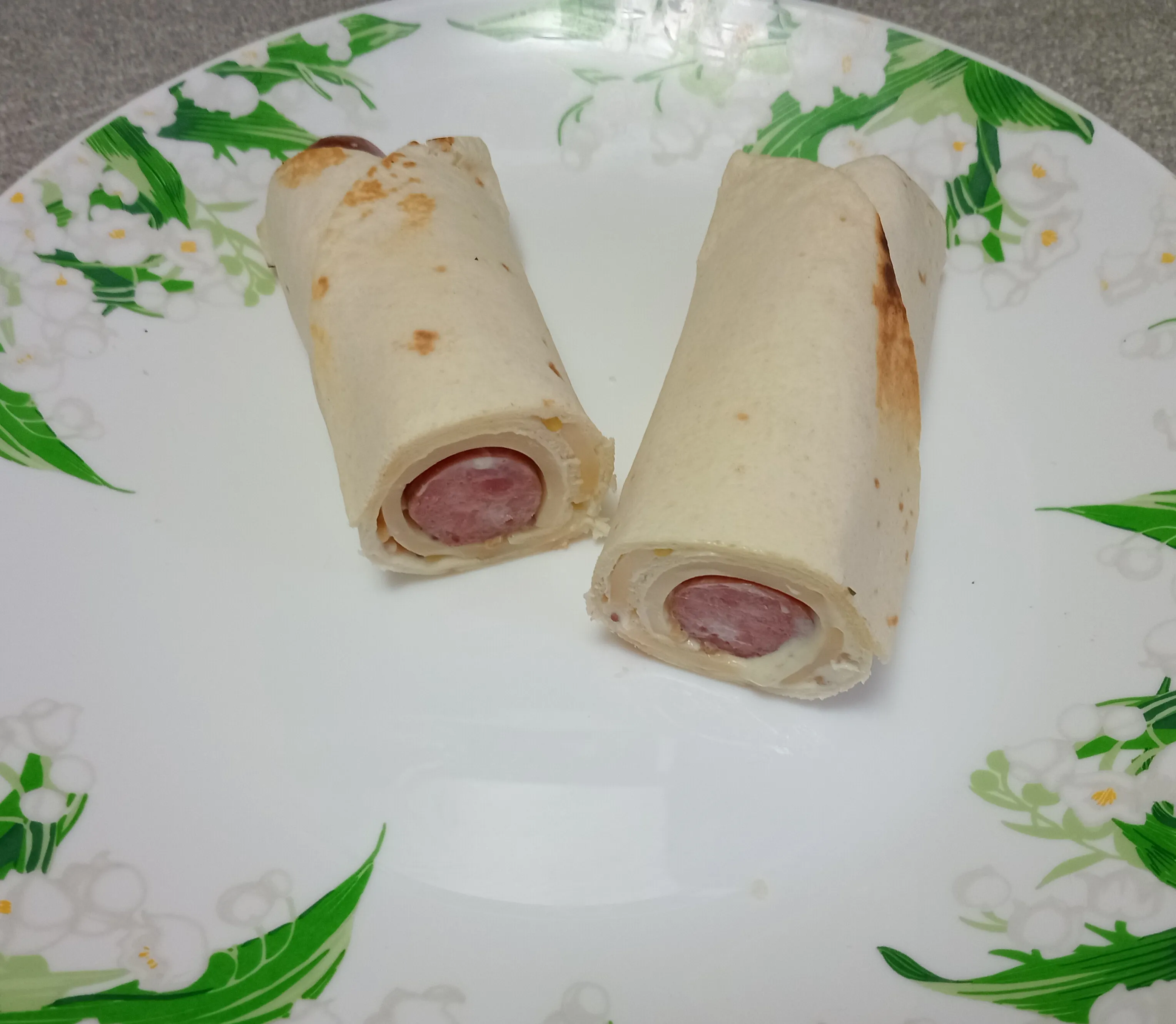 Положите сверху копчёную колбаску или сосиску по вкусу. Сверните тортилью рулетом.