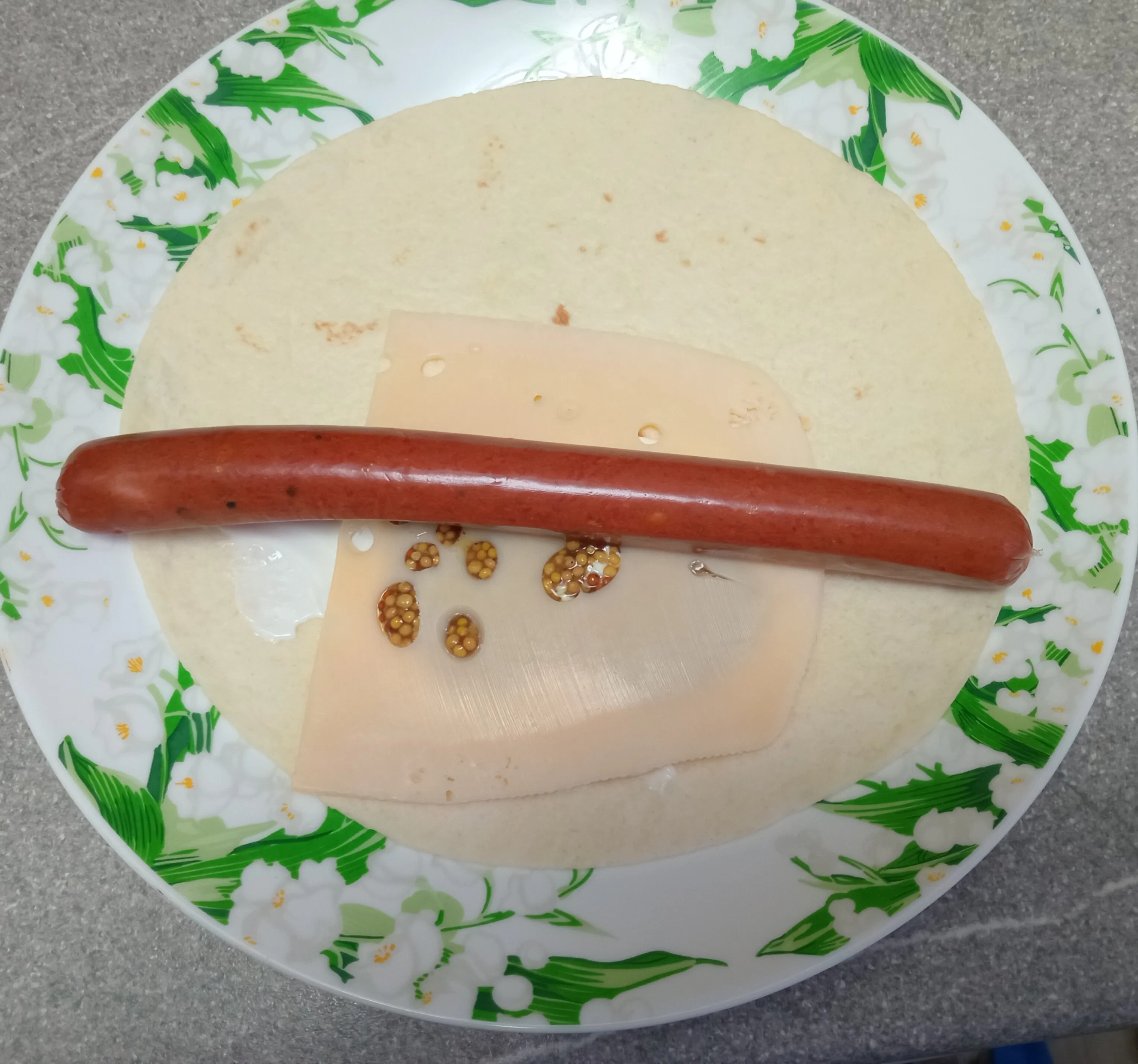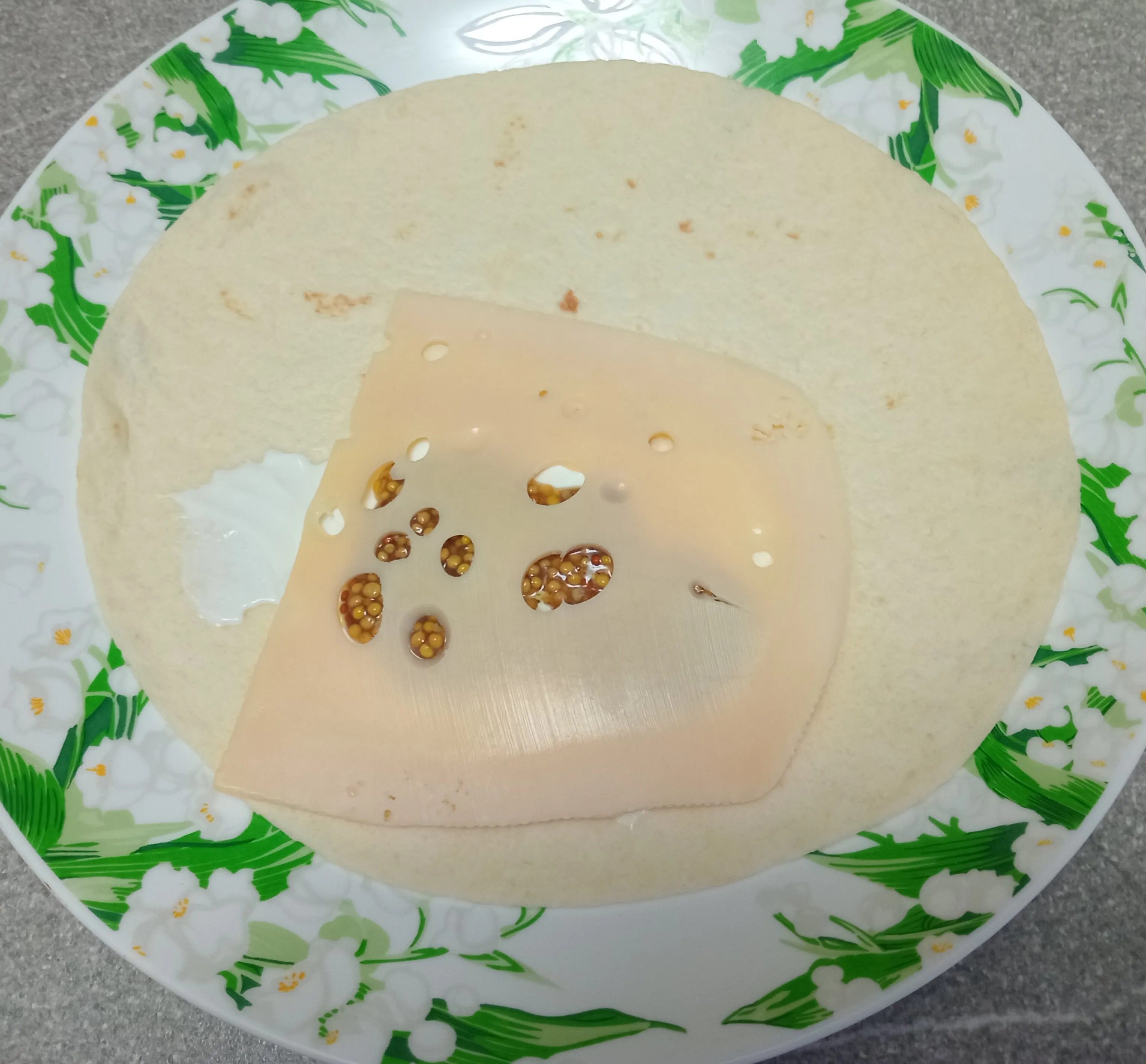 На тортилью положите сметану и зернистую горчицу. Сверху выложите ломтик сыра.