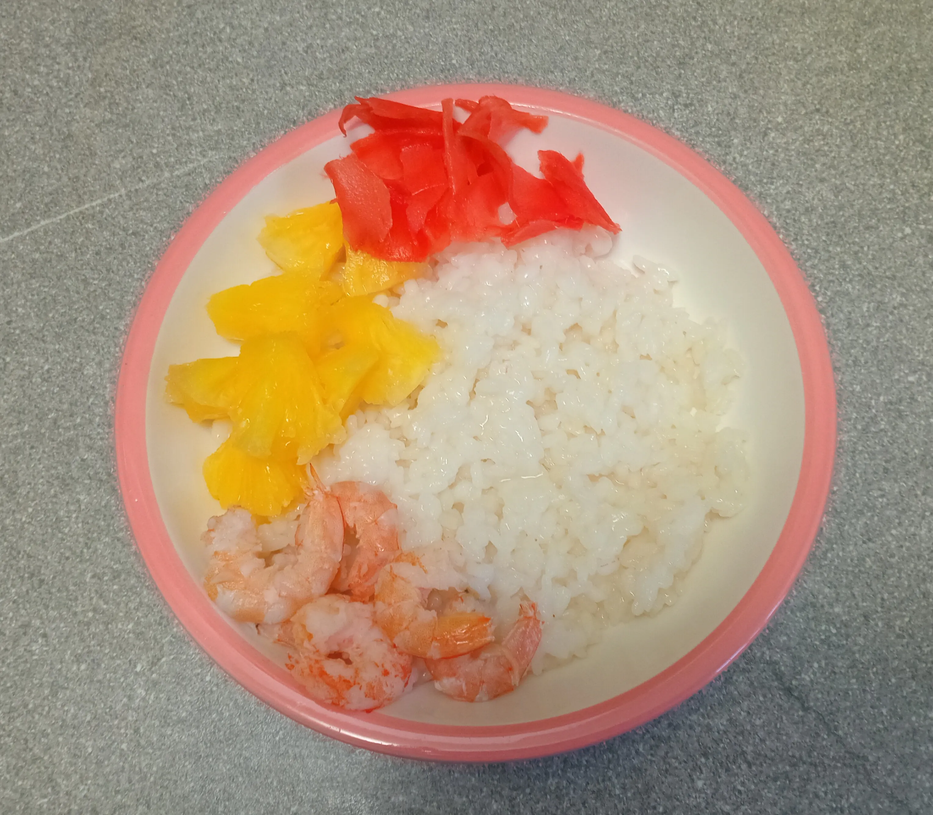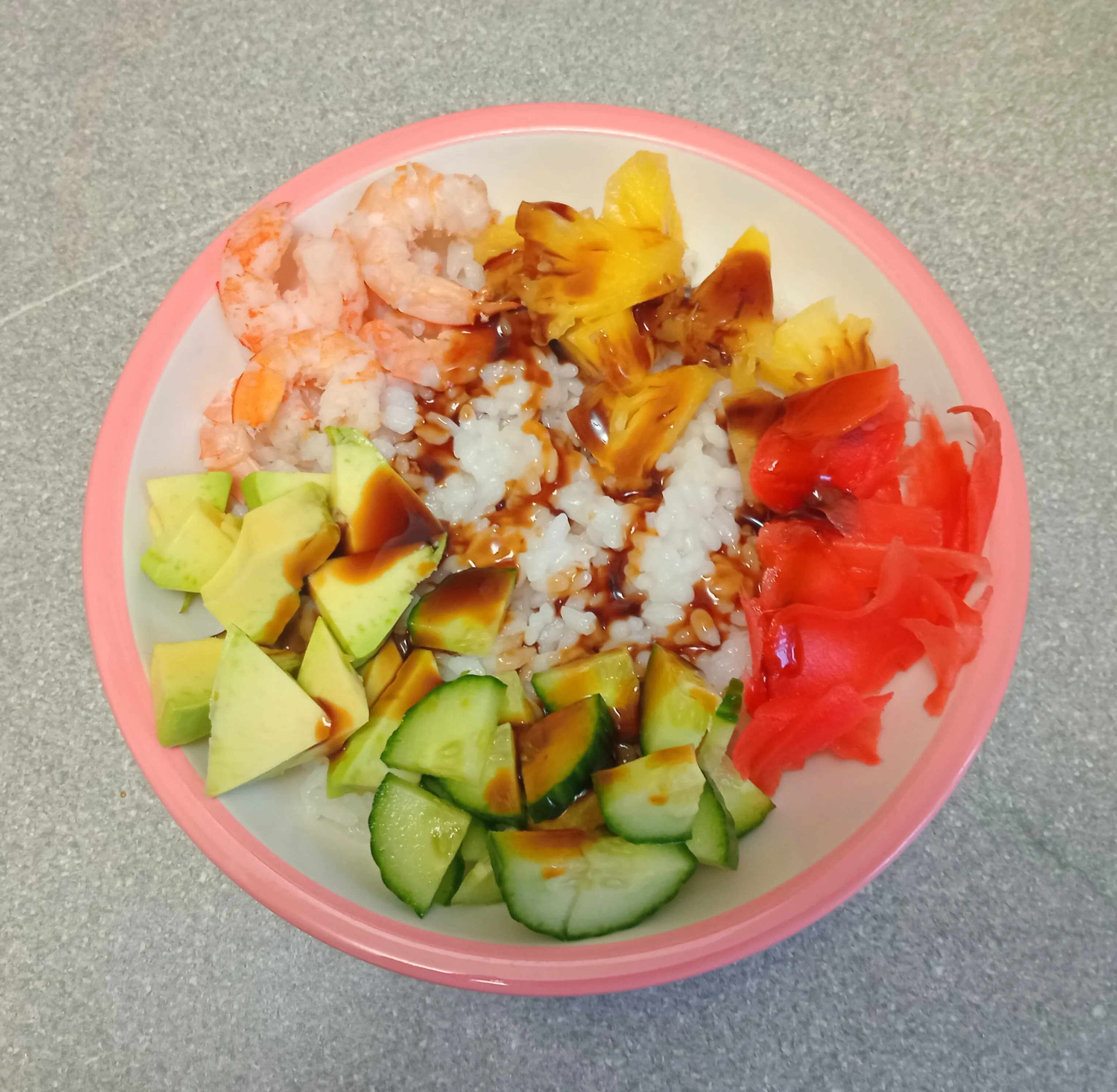 Рис белый 60 гАнанас консервированный 50 гОгурец 50 гАвокадо 50 гИмбирь маринованный 30 гСоус терияки 1 ст.л.РЕЦЕПТ ПРИГОТОВЛЕНИЯ
