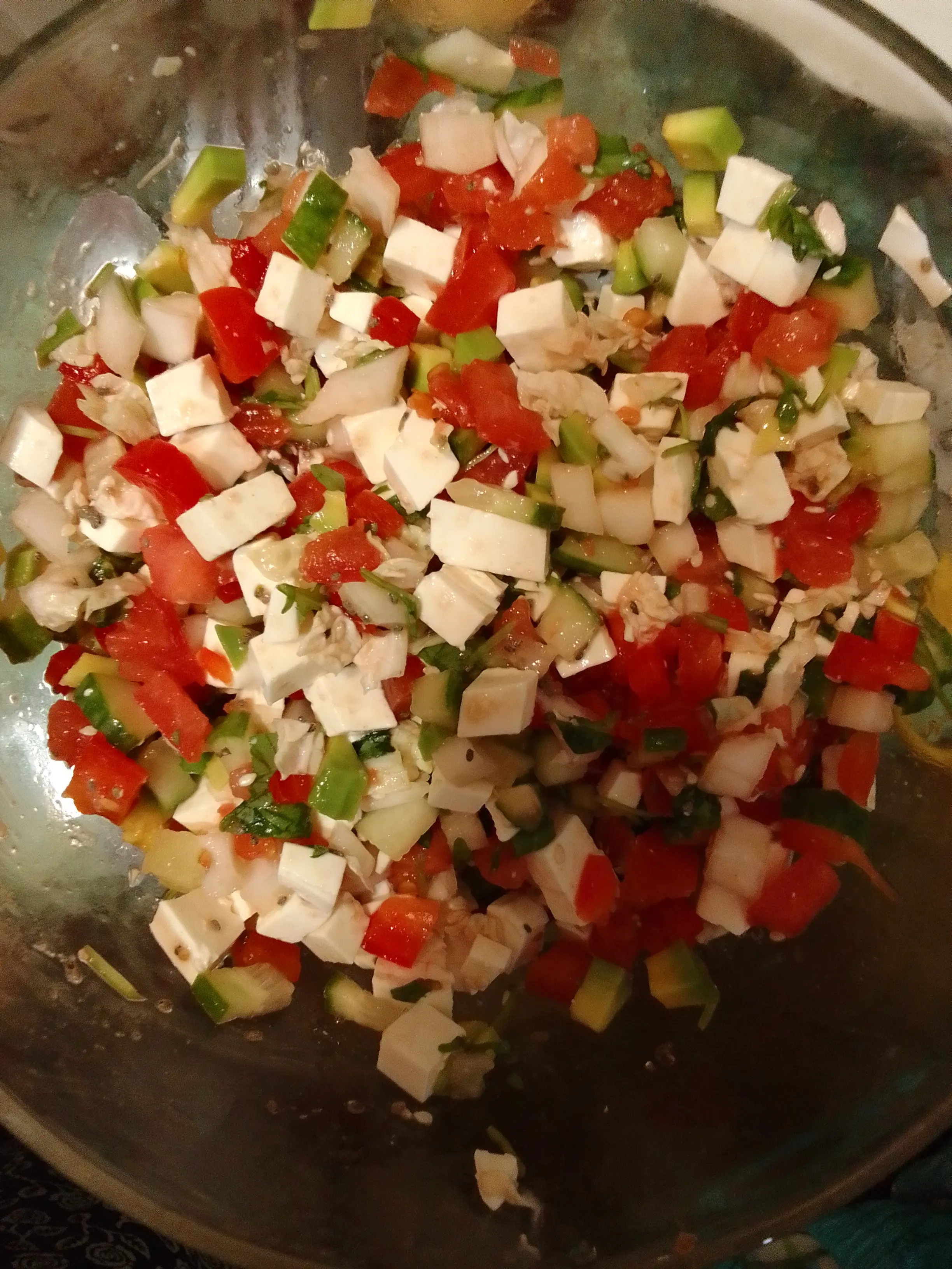 Достаньте сыр фета, порежьте его небольшим кубиками, ориентируясь на размер овощей.