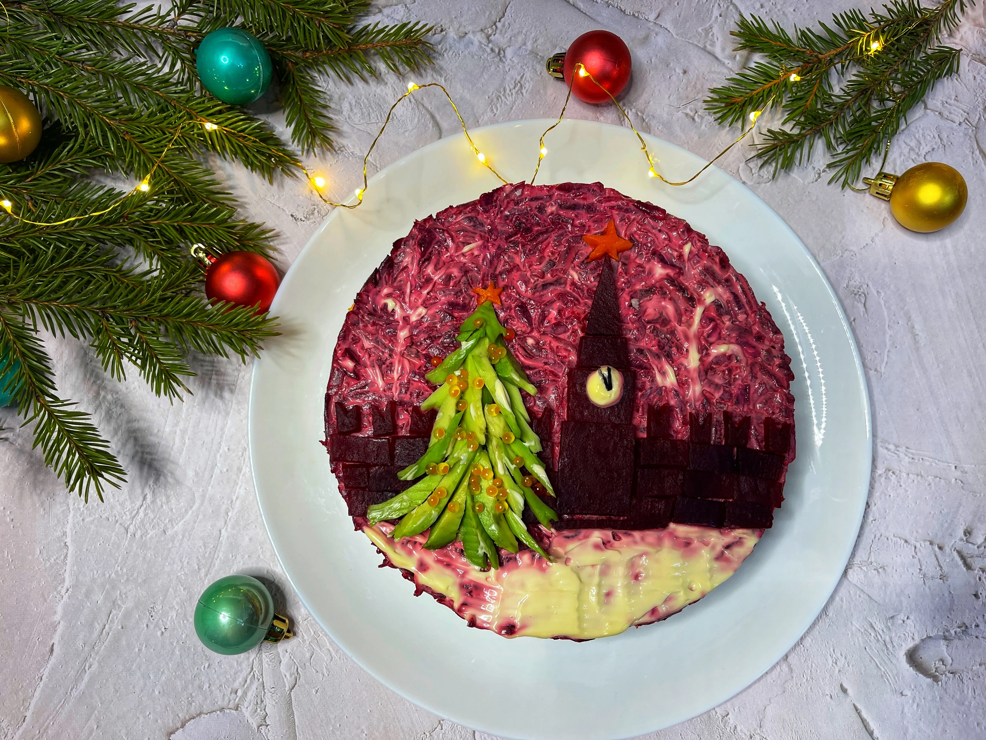 Выложите Кремль, вырезанный из свёклы и моркови. Затем вырежьте из авокадо кусочки, из которых сложите ёлочку. Украсьте ёлочку красной икрой.