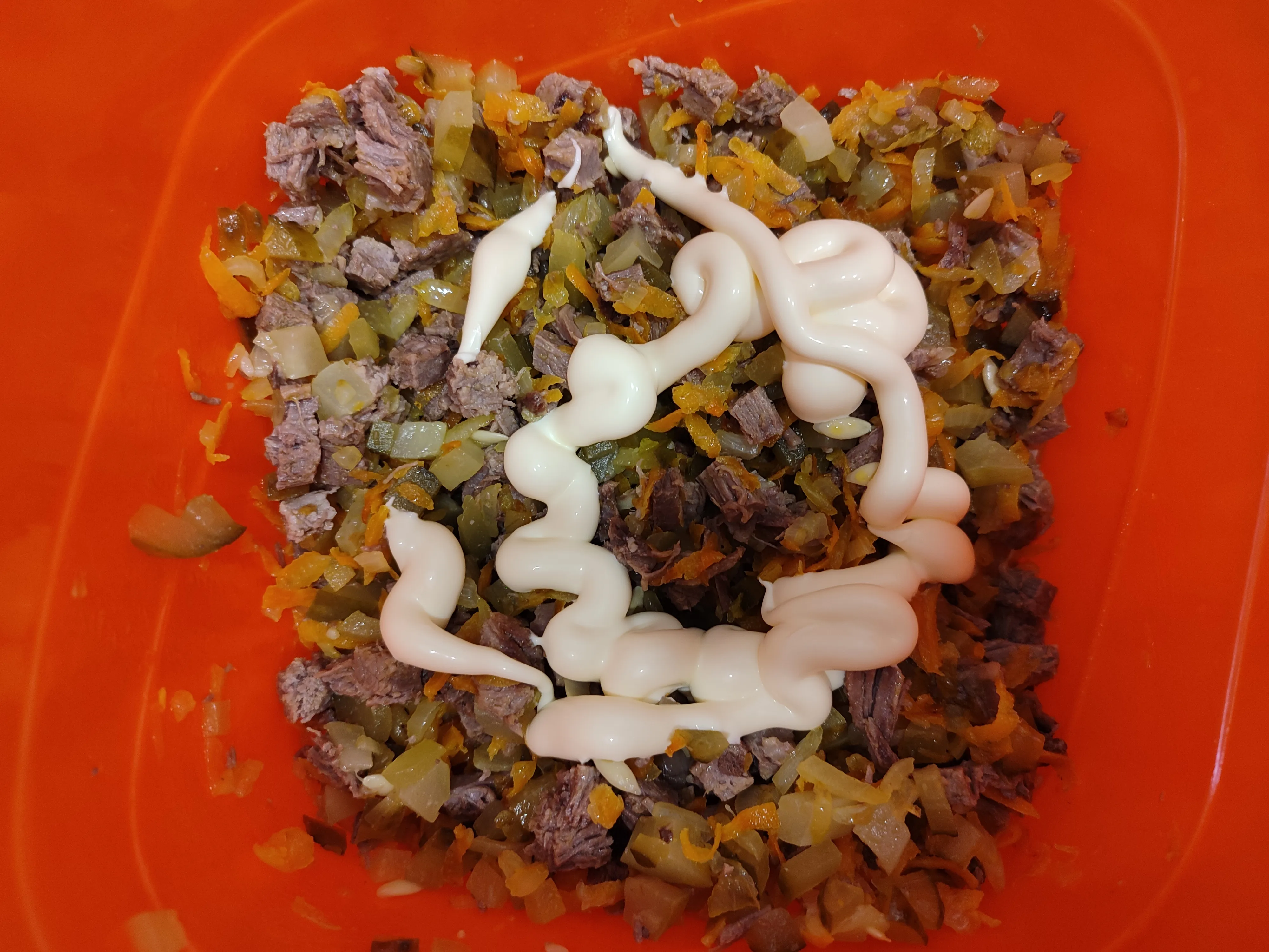 Положите нужное количество майонеза, хорошенько перемешайте ингредиенты.