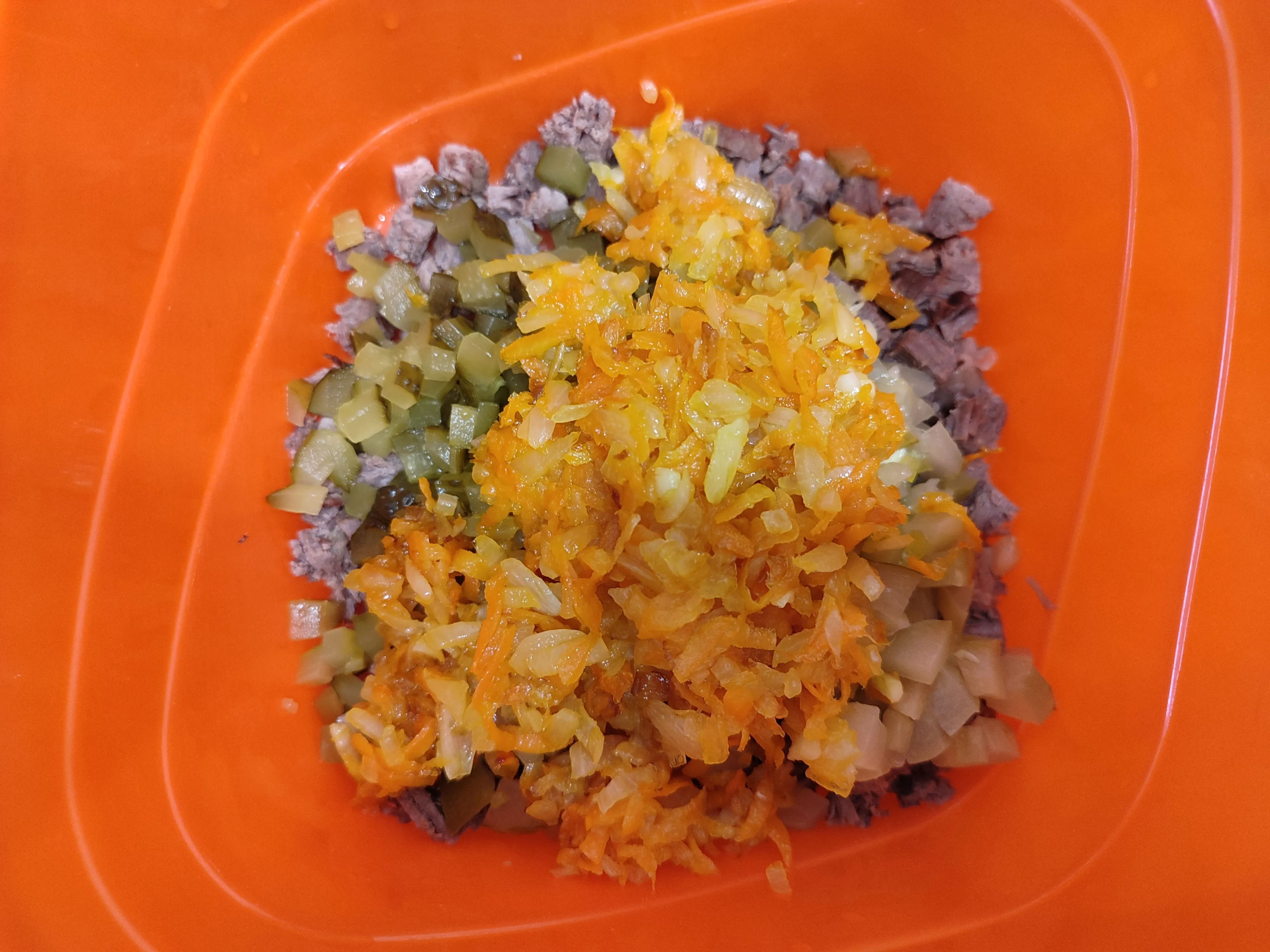 Подготовьте все необходимые ингредиенты. Очистите репчатый лук, морковь. Отварите говяжье мясо. Очищенный репчатый лук нарежьте, морковь натрите на крупной тёрке. Обжарьте овощи на растительном масле до мягкого состояния.