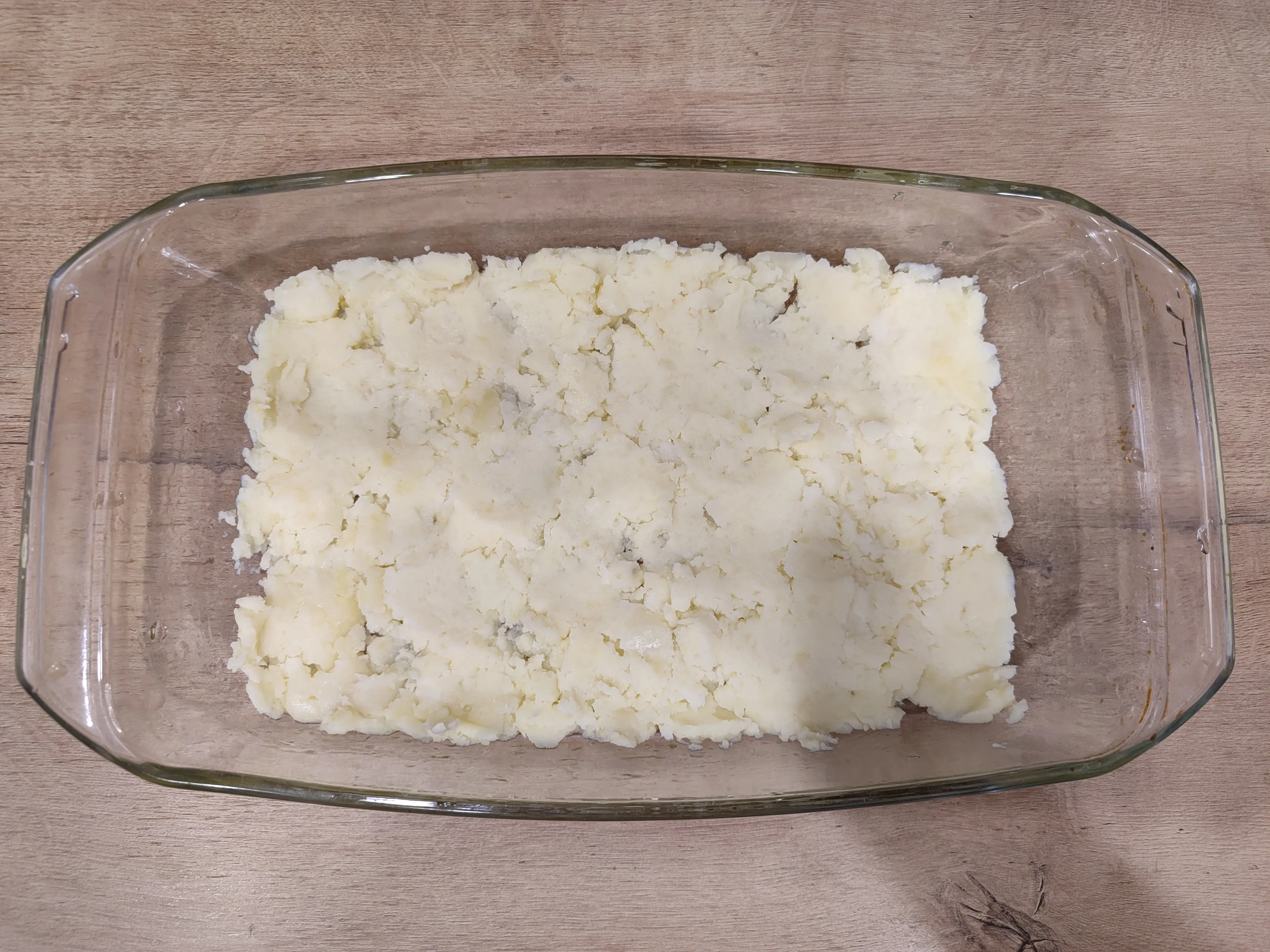 Слегка смажьте форму для запекания растительным маслом. Разделите картофельное пюре на две части. На самое дно формы выложите слой картофельного пюре.