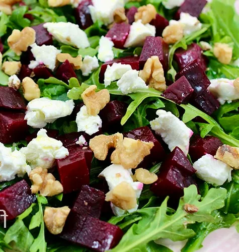Нарежьте кубиками свёклу и сыр Моцарелла, измельчите орехи