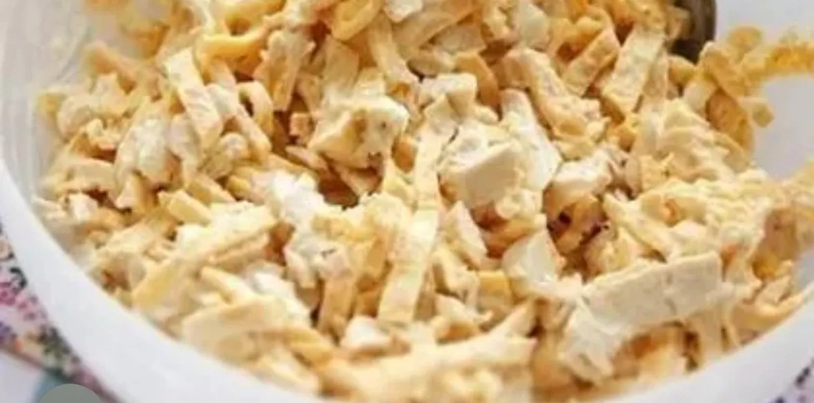 Отварную грудку разберите на волокна. Яичные блинчики нарежьте полосками. Всё смешайте с майонезом. Дайте настояться салату ночь в холодильнике.