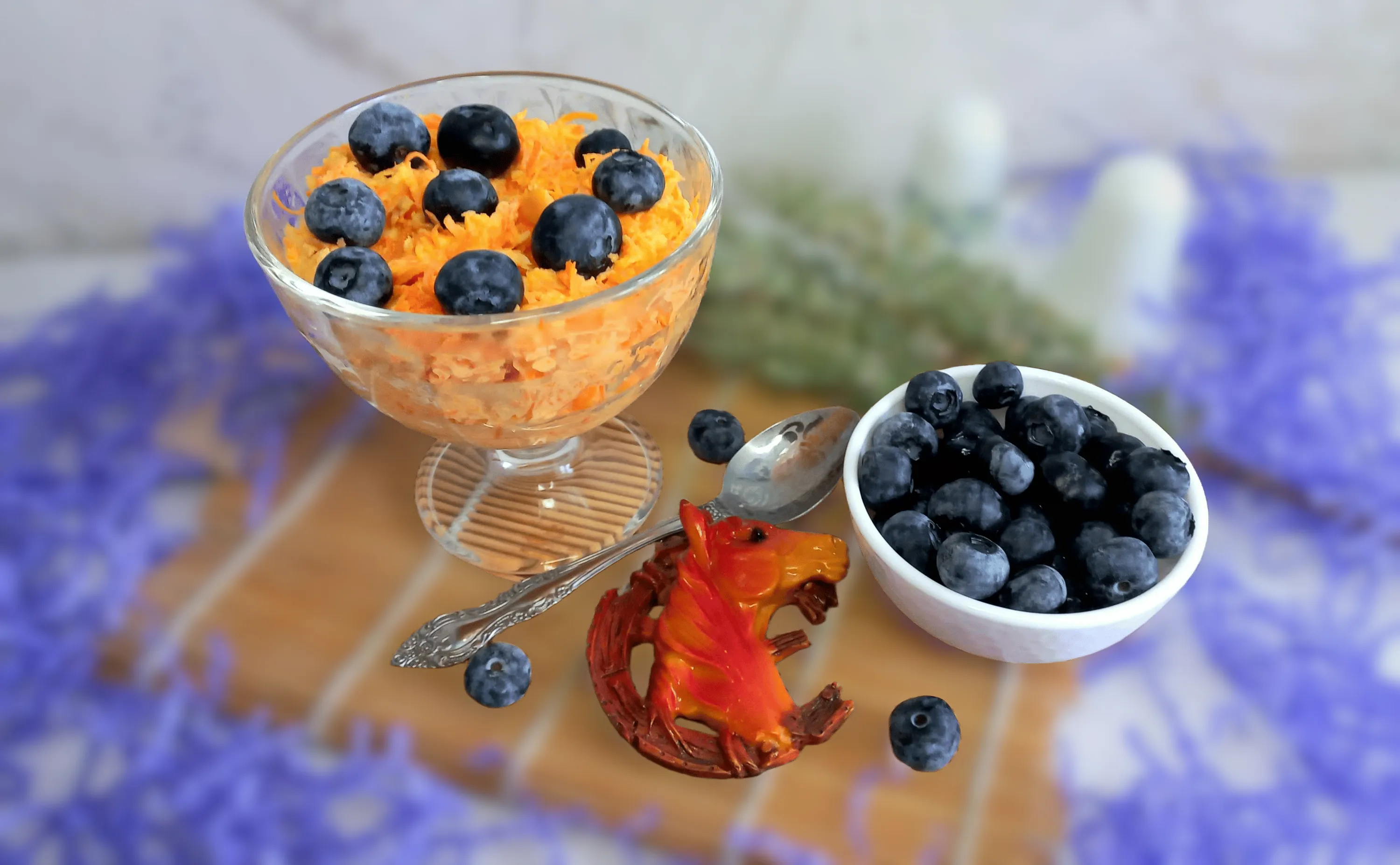 Красная Огненная Лошадь — символ 2026 года. Хозяйка года любит свежие овощи и фрукты, а также простоту и натуральность. Яркий, лёгкий салат из моркови, яблока и голубики станет актуальным блюдом новогоднего застолья.