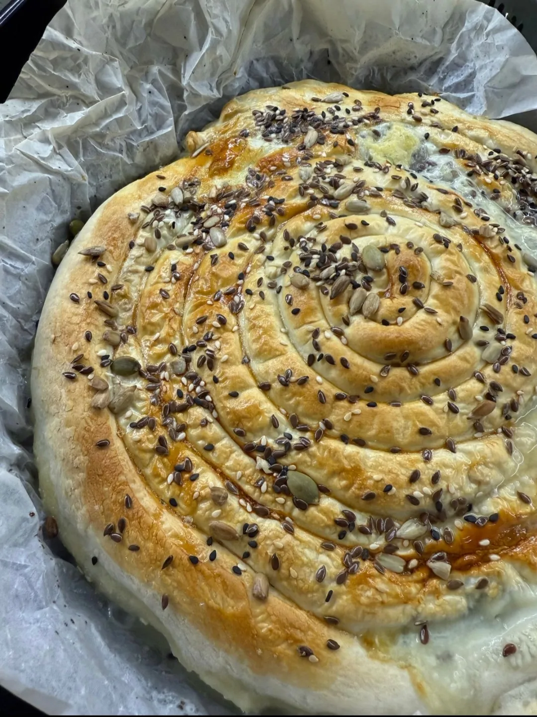 Смажьте улитку яйцом и посыпьте сверху смесью семян по вкусу. Духовку разогрейте до 180°С и выпекайте 30 минут до золотистого цвета.