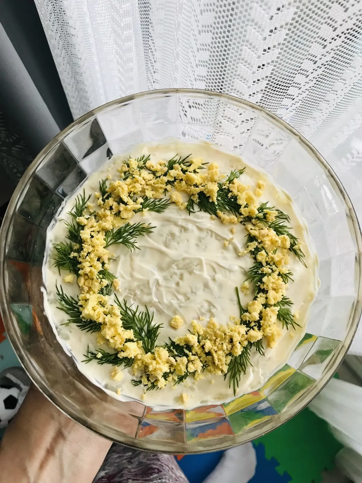 Приступайте к сборке: слоями разложите шпроты, замаринованный лук, натёртые на тёрке белки, морковь и картофель. Каждый слой слегка смажьте майонезом, сверху салат украсьте зеленью и яичными желтками.