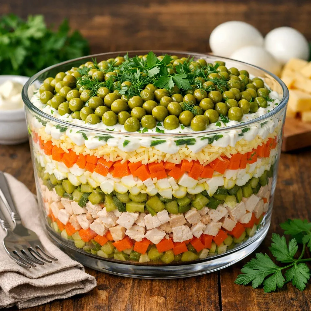 Выложите ингредиенты в прозрачную салатницу слоями по очереди: куриное филе, солёные огурцы, морковь, яйца, тёртый сыр. Шестой слой: консервированный горошек. Украсьте зеленью перед подачей.