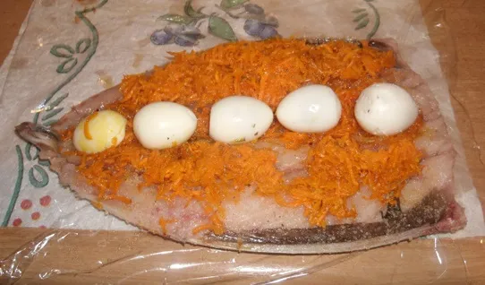 Тушку рыбы изнутри посыпьте приправой для рыбы, посыпьте желатином. Сверху выложите морковь и по месту, где был хребет, плотно друг к другу выложите перепелиные яйца.