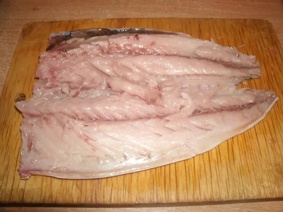 У скумбрии уберите кости: вырежьте хребет, крупные кости выньте. Разложите тушку на доске. Отварите яйца, остудите, очистите.