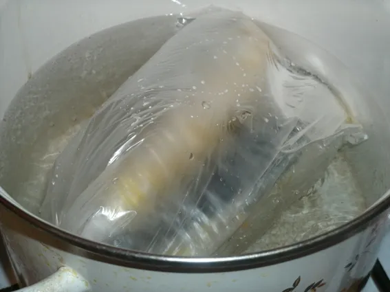 Затем поместите рыбу в полиэтиленовый пакет, завязанный так, чтобы внутрь него не проникала вода. Варите в кастрюле с водой 30-40 минут.