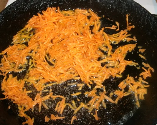 Морковь натрите на тёрке и обжарьте с небольшим количеством растительного масла до мягкости.