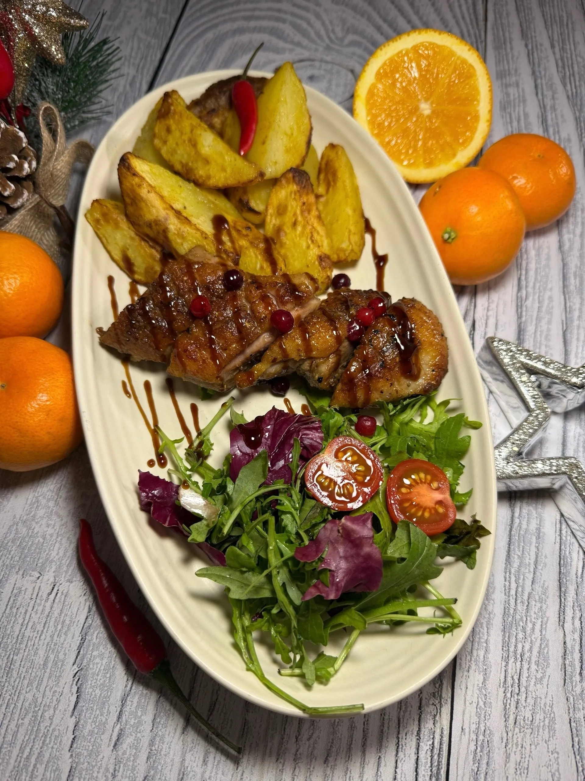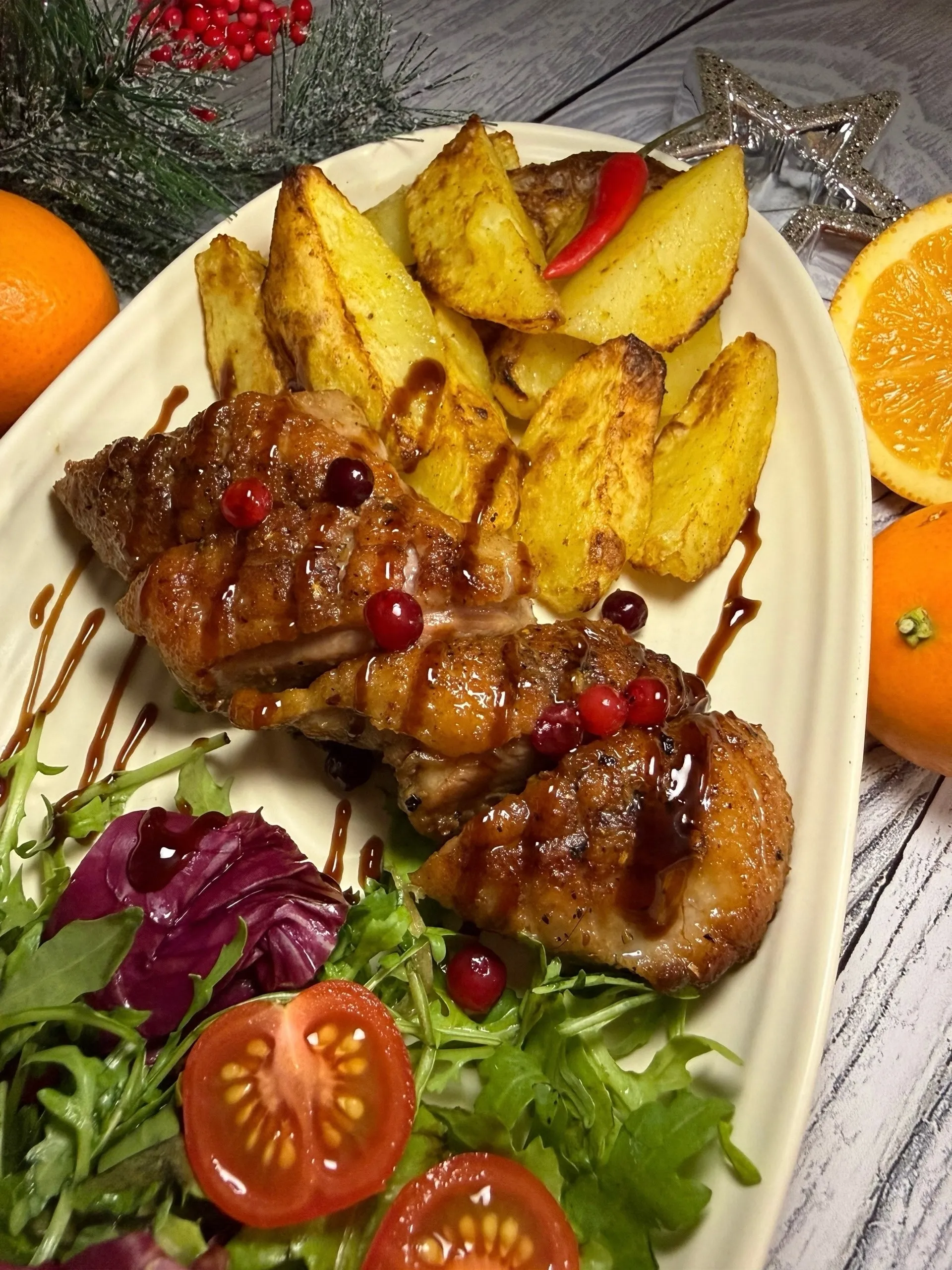 Запечённая утиная грудка под брусничным соусом — это классика зимнего стола, которая идеально подходит для новогоднего ужина. Нежное, сочное мясо утки с румяной корочкой оттеняется кисло-сладким соусом из брусники, а лёгкий салат добавляет баланса и свежести. К слову, в северных странах бруснику традиционно подавали к жирному мясу не только из-за вкуса, но и потому, что она помогает легче переваривать тяжёлые блюда — отличное решение для праздничного застолья!