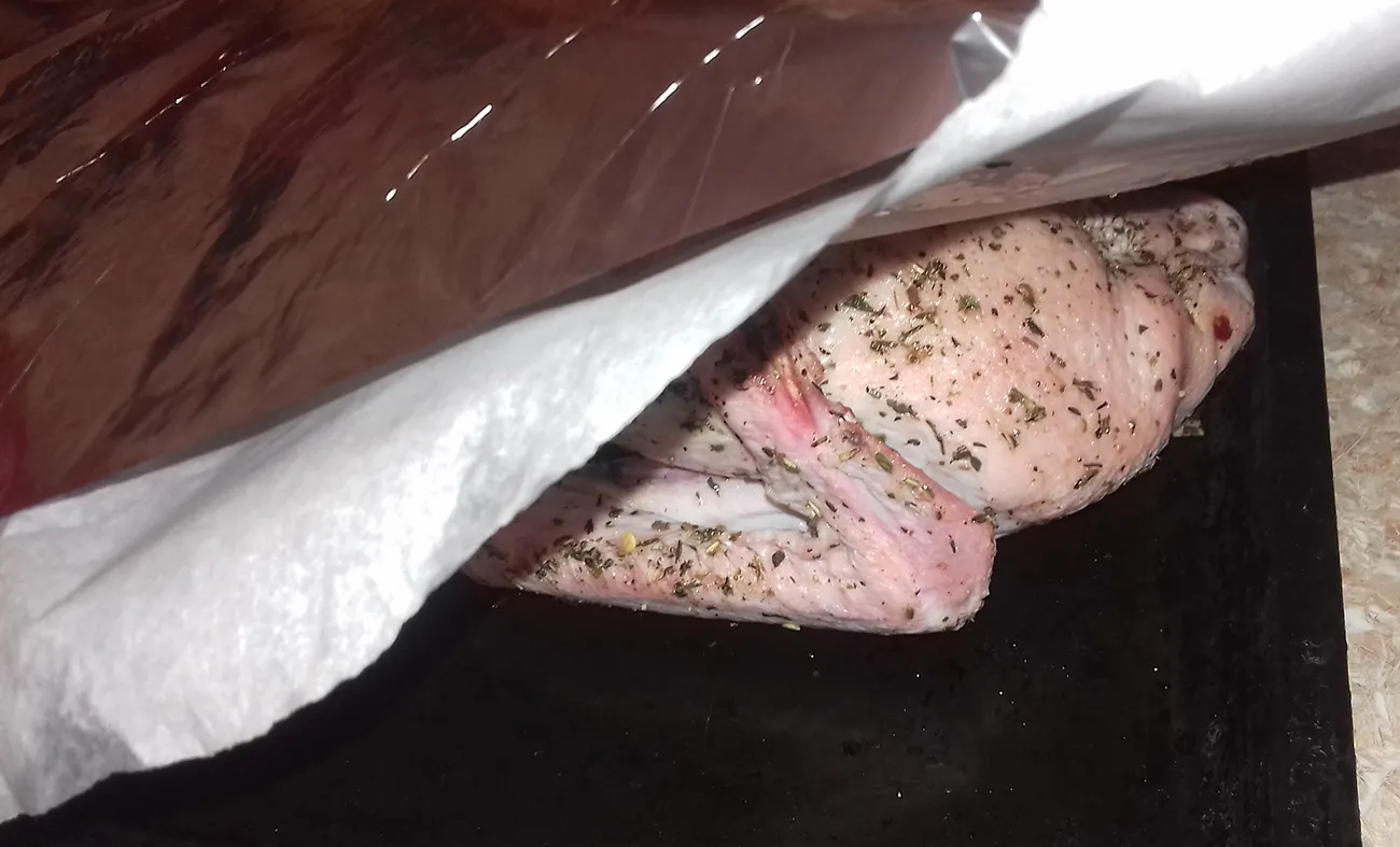 Накройте утку сначала бумагой для выпечки, потом фольгой и отправьте запекаться в духовку на 1,5 часа.
