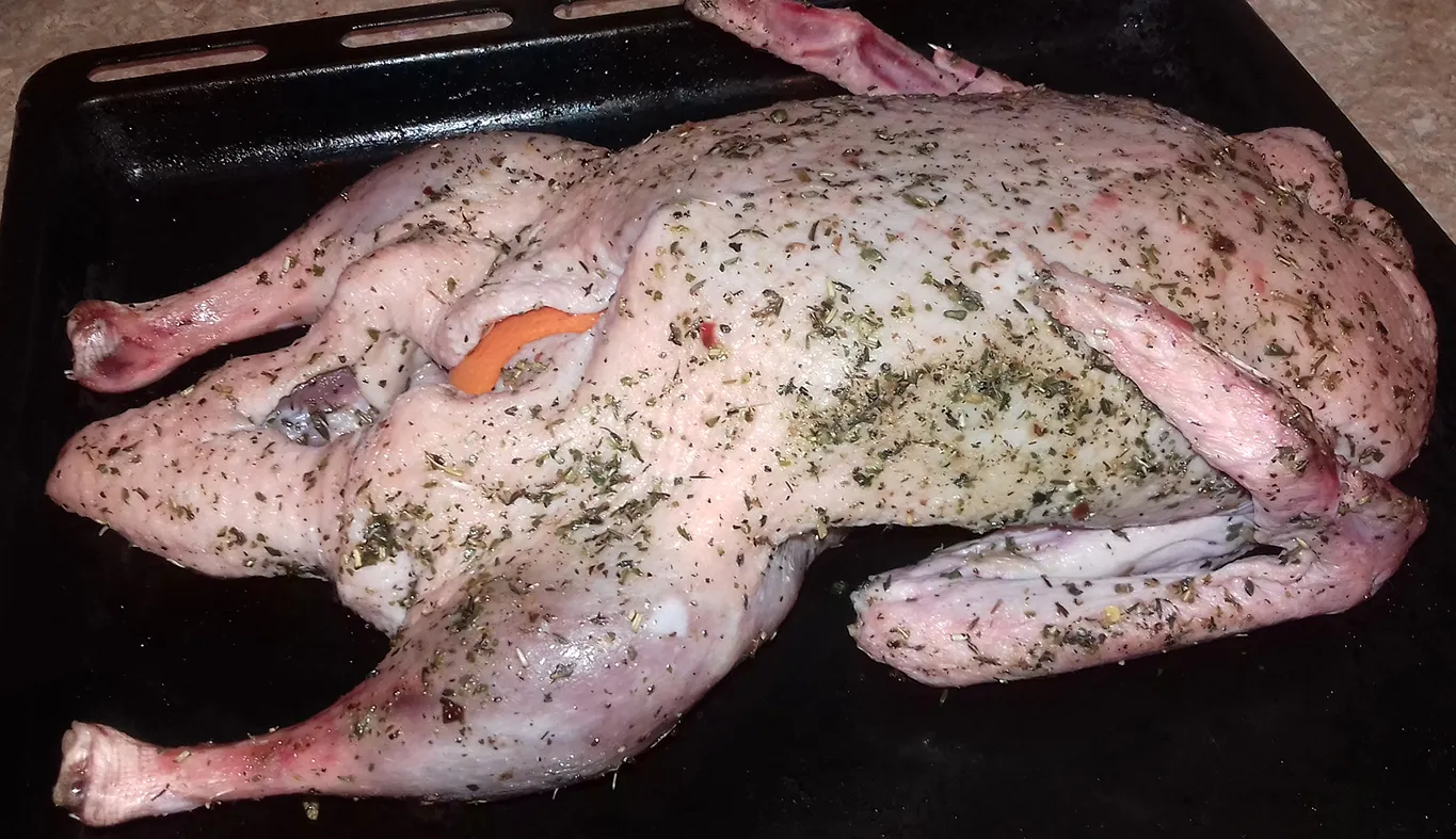 Смешайте растительное масло с прованскими травами. Натрите тушку утки снаружи и внутри солью, затем смесью масла и трав. Оставьте мариноваться на 2-3 часа.