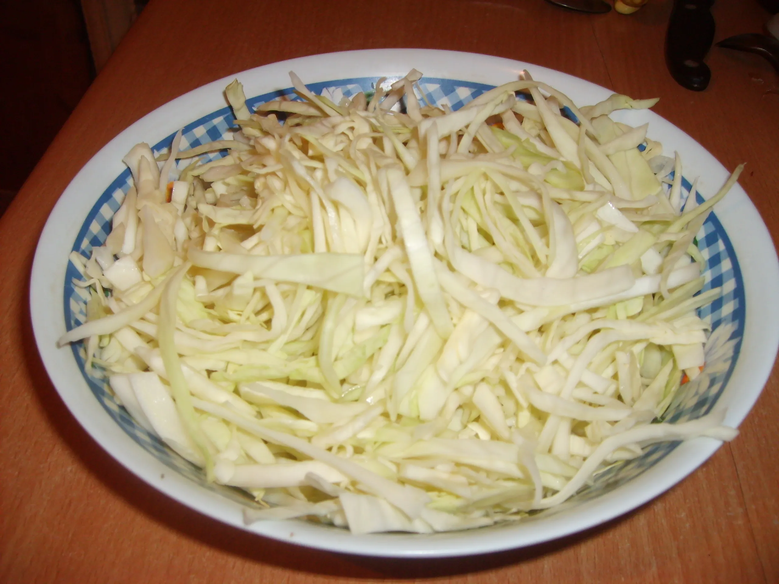 Капусту нашинкуйте соломкой, нужно её отжать, чтобы она пустила сок, обминайте до мягкости.