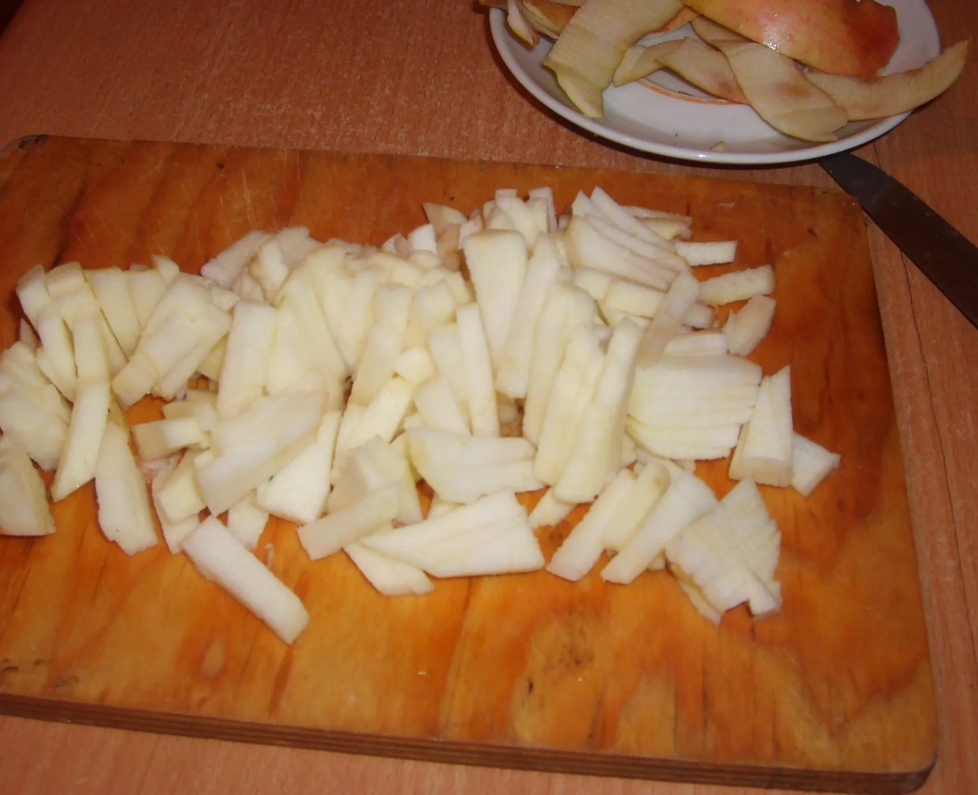 Яблоко очистите от кожуры и семядолей, нарежьте соломкой. Отправьте к остальным ингредиентам.
