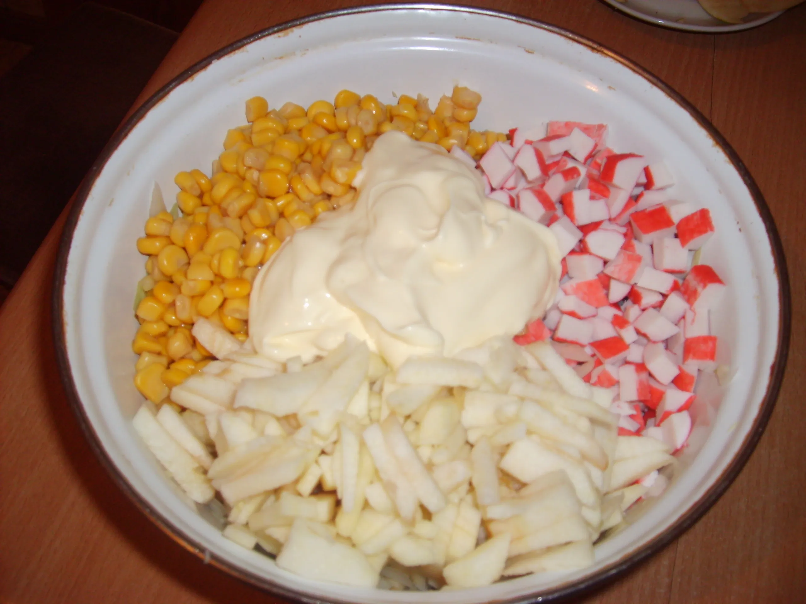 Соедините в миске все ингредиенты и заправьте майонезом. Тщательно перемешайте.