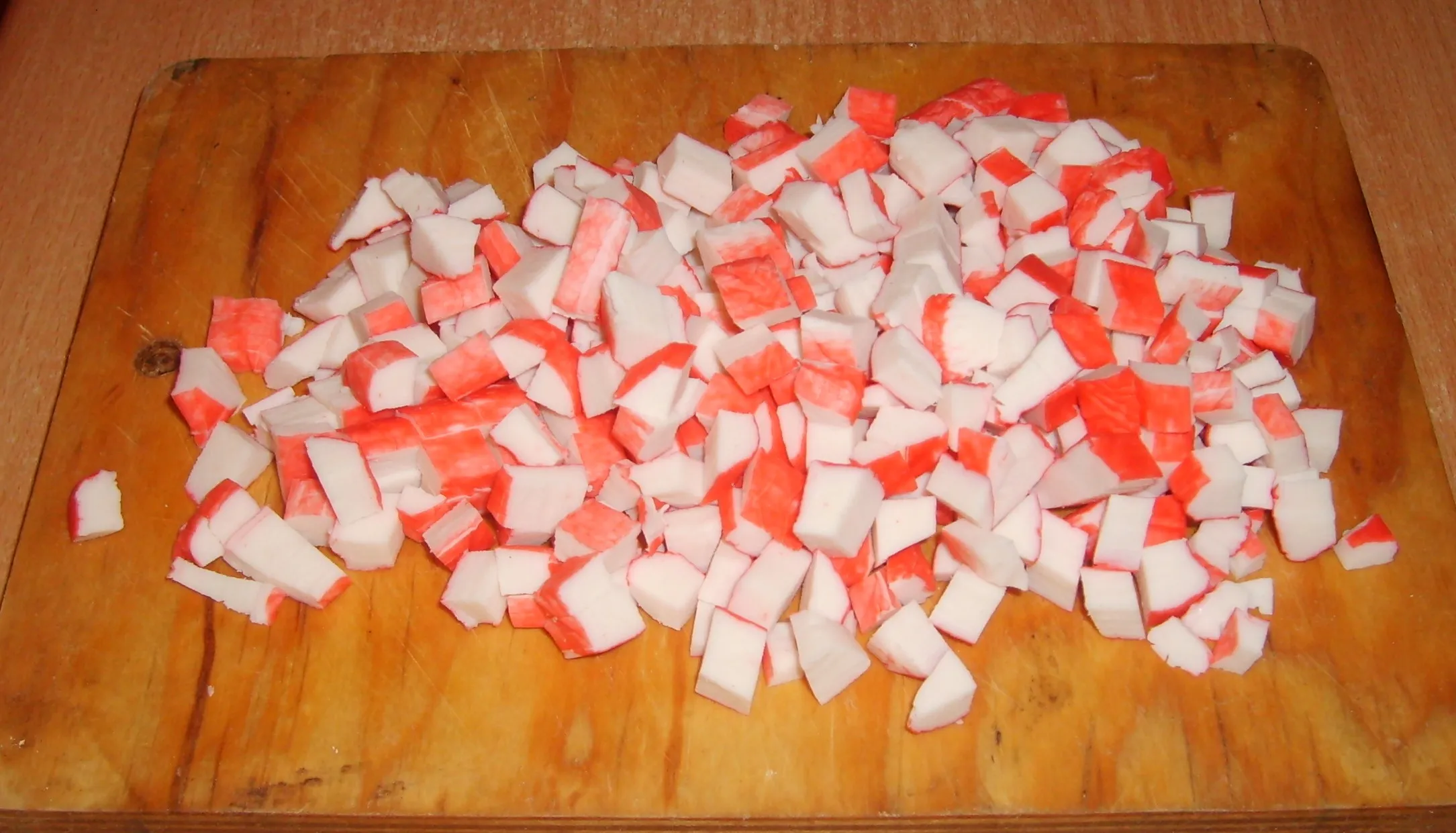 Крабовые палочки нарежьте мелкими кубиками. Отправьте к капусте.